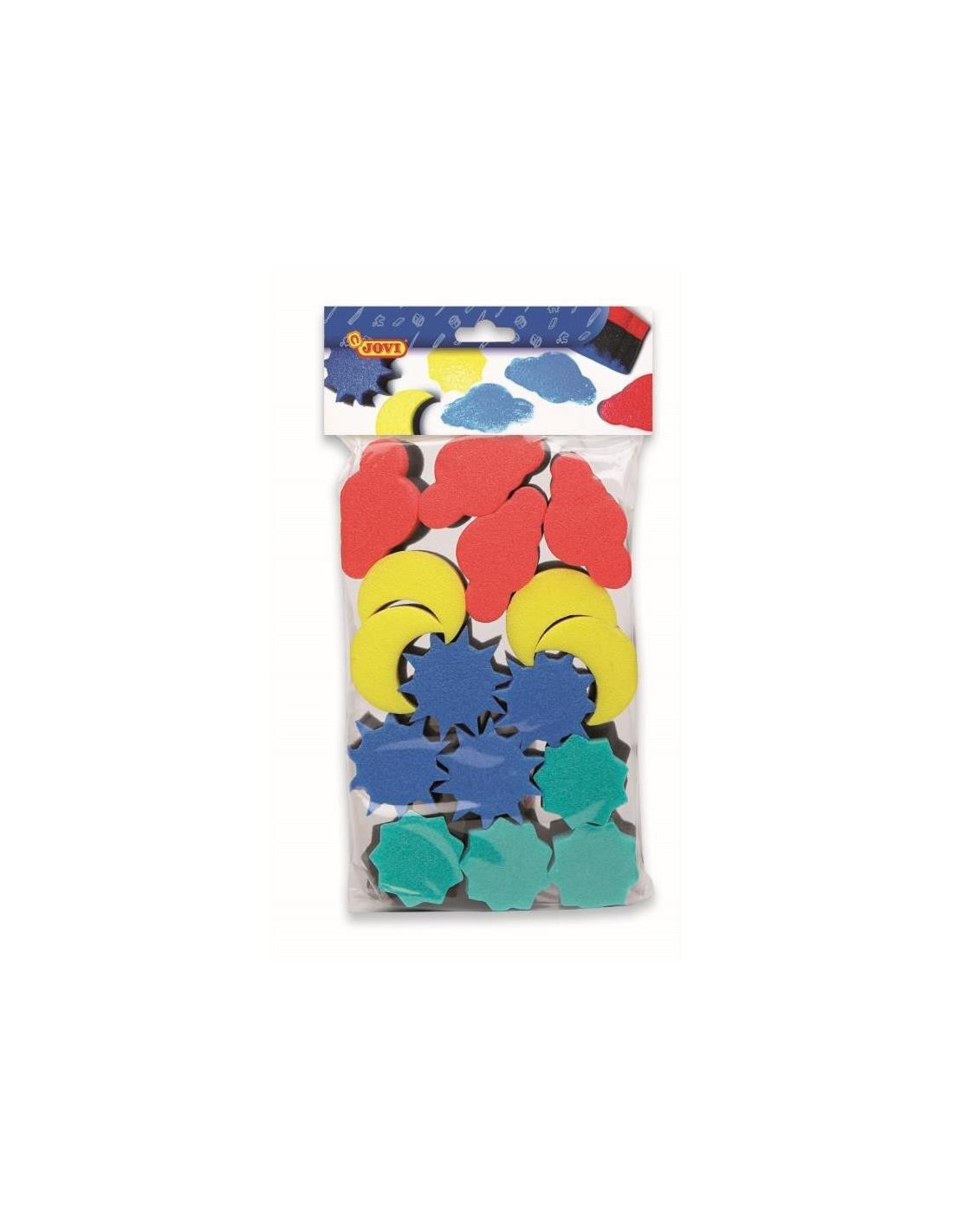 Juego de esponjas para estampación con formas diversas. Permite hacer estampación con cualquier tipo de pintura, solo hay que mojar la esponja en pintura, y estampar su forma sobre cualquier superficie. fabricado en dos materiales, uno más duro para poder agarrar, y otro más blando para realizar la estampación.