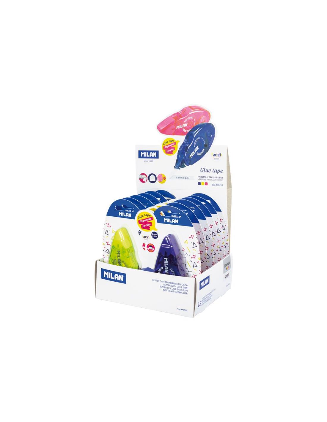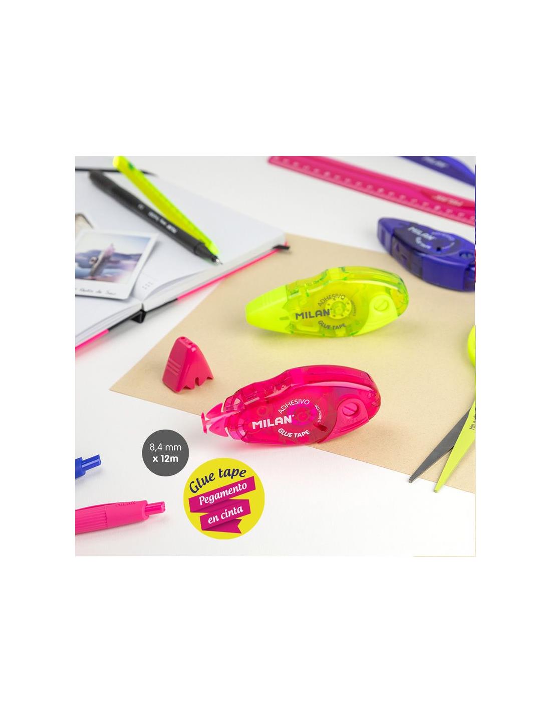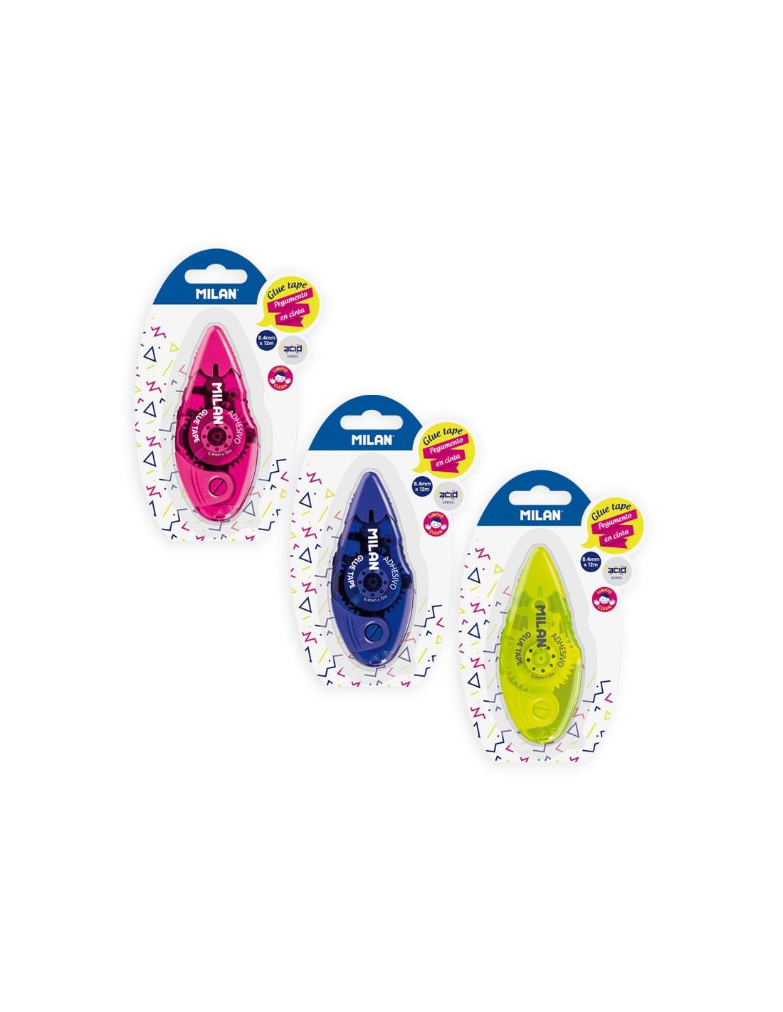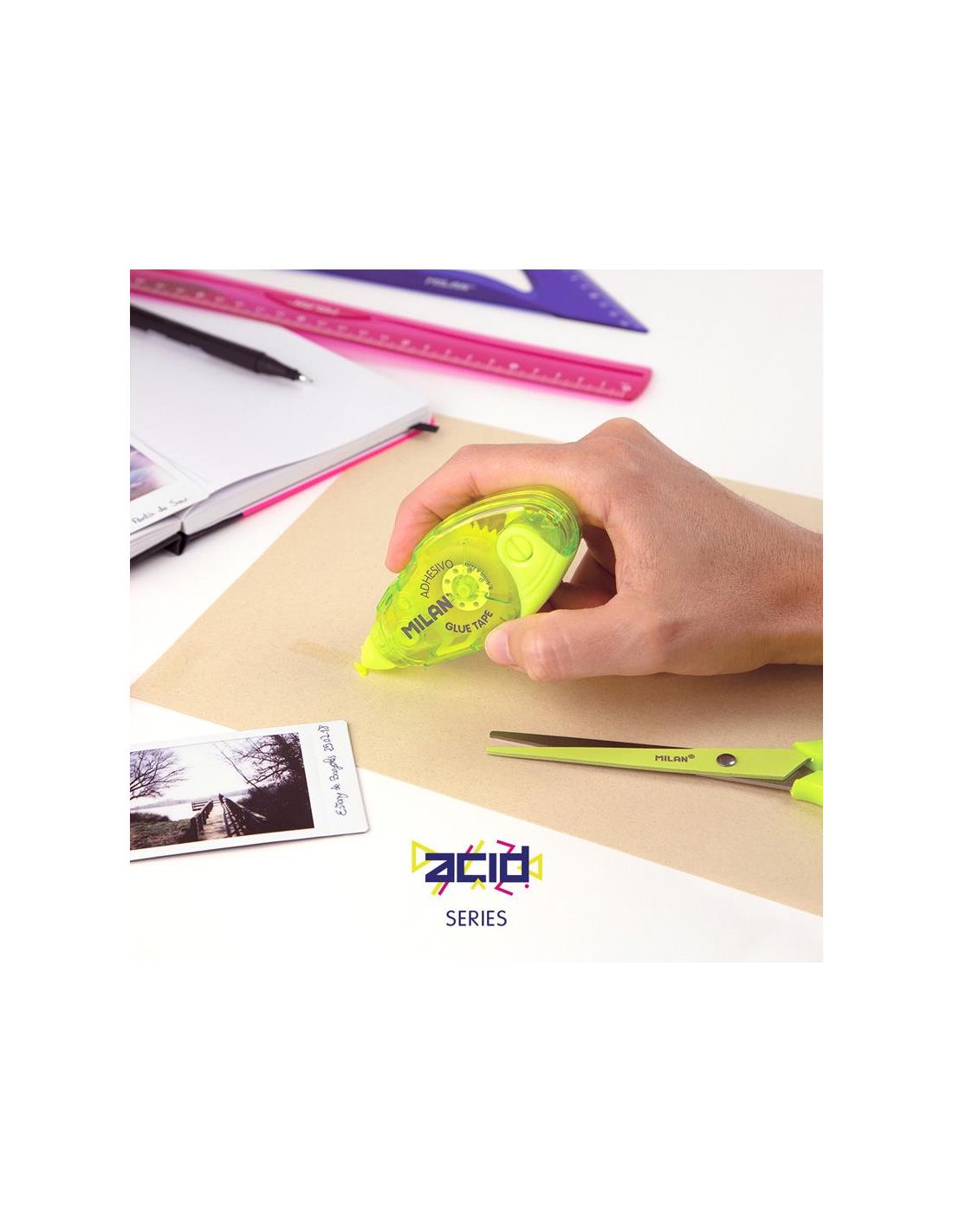 Pegamento en cinta versátil, de aplicación precisa y fácil de usar. Secado rápido. Diseño ergonómico, con un capuchón que proteje la punta. Ideal para manualidades, scrapbooking y albumes fotográficos. Serie Acid, en 3 colores translúcidos: azul, amarillo y rosa. 8,4 mm de ancho x 12 m de largo.