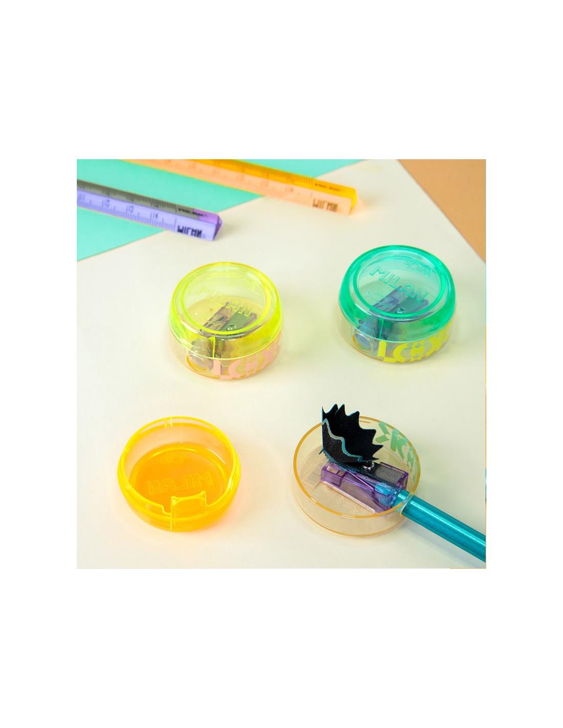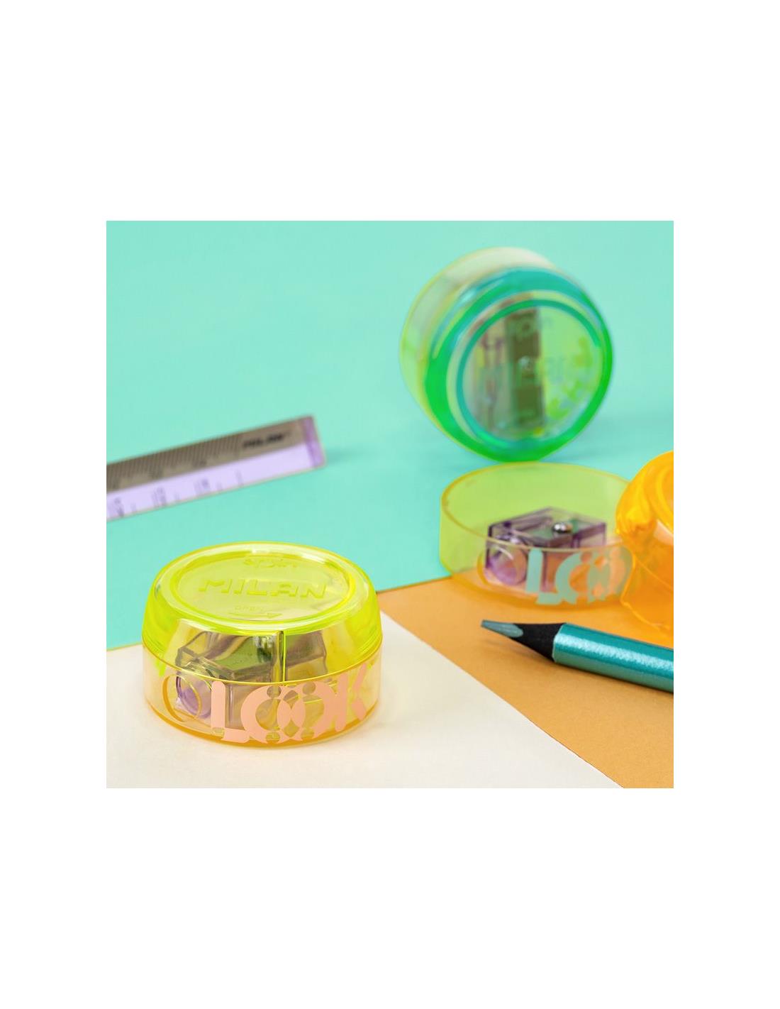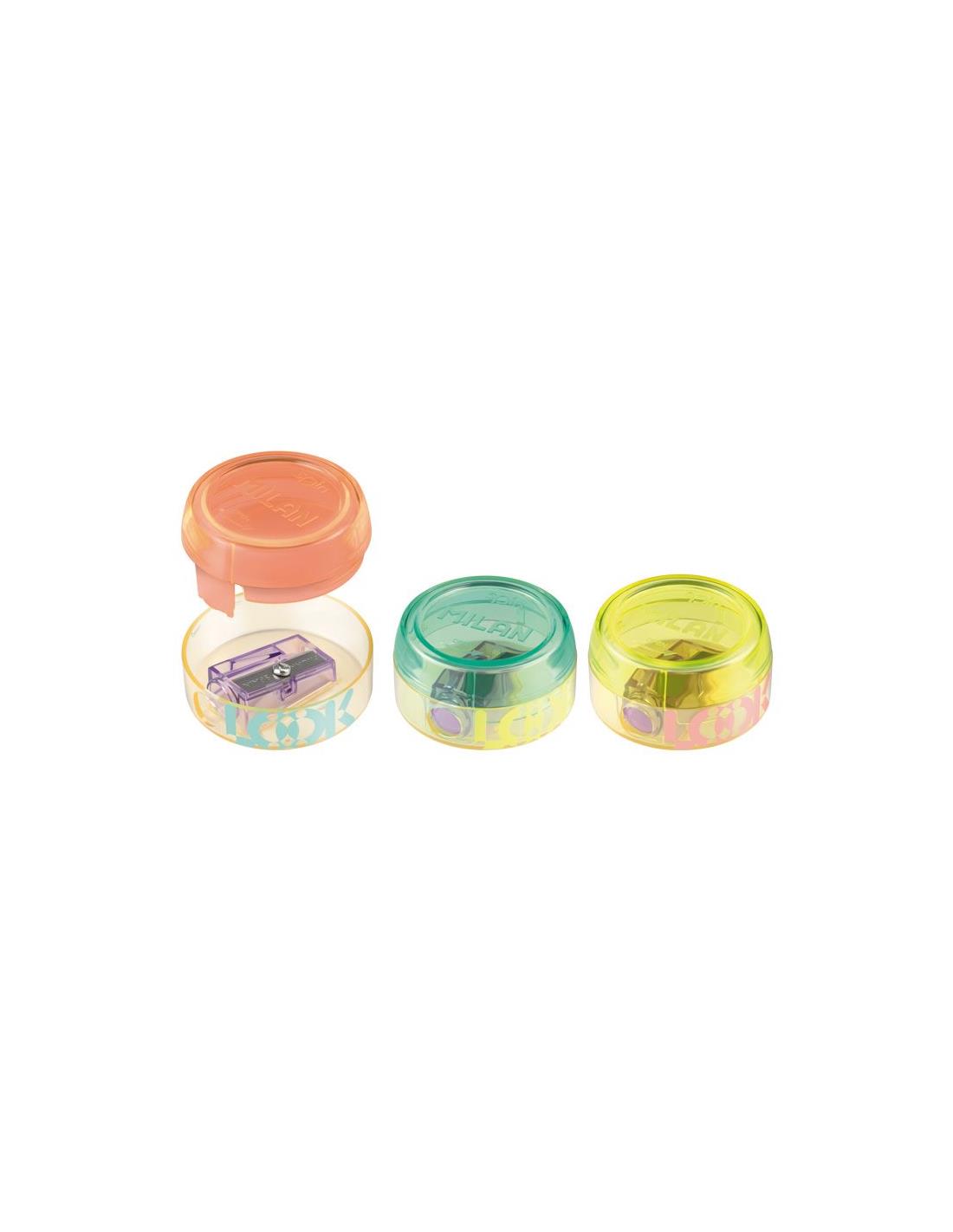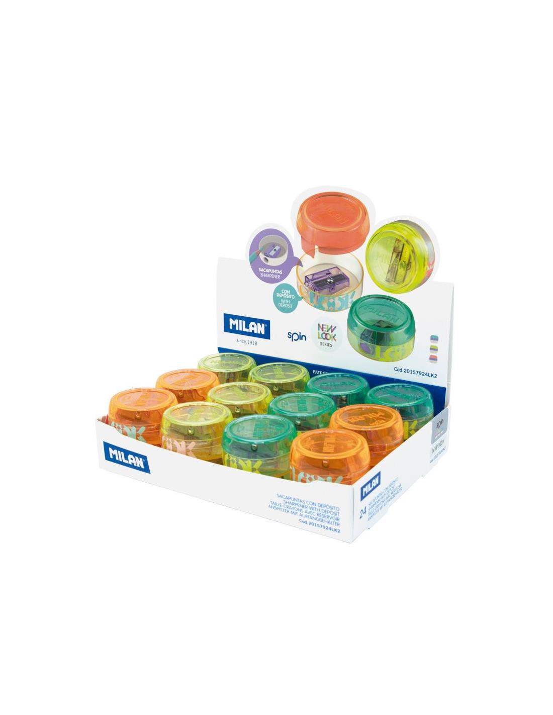 Afilalápices con depósito enroscado diseño SPIN, serie New Look. El sacapuntas tiene una hoja de acero afilada y resistente, ideal para todo tipo de lápices. Sacapuntas con hoja de seguridad: este sistema evita que la hoja se separe del cuerpo del sacapuntas. Diseño original creado por el departamento de I+D de MILAN. Serie New Look: un juego de materiales transparentes y colores brillantes que permite ver el interior de los productos, con sus piezas y mecanismos. Disponible en tres combinaciones de colores.
