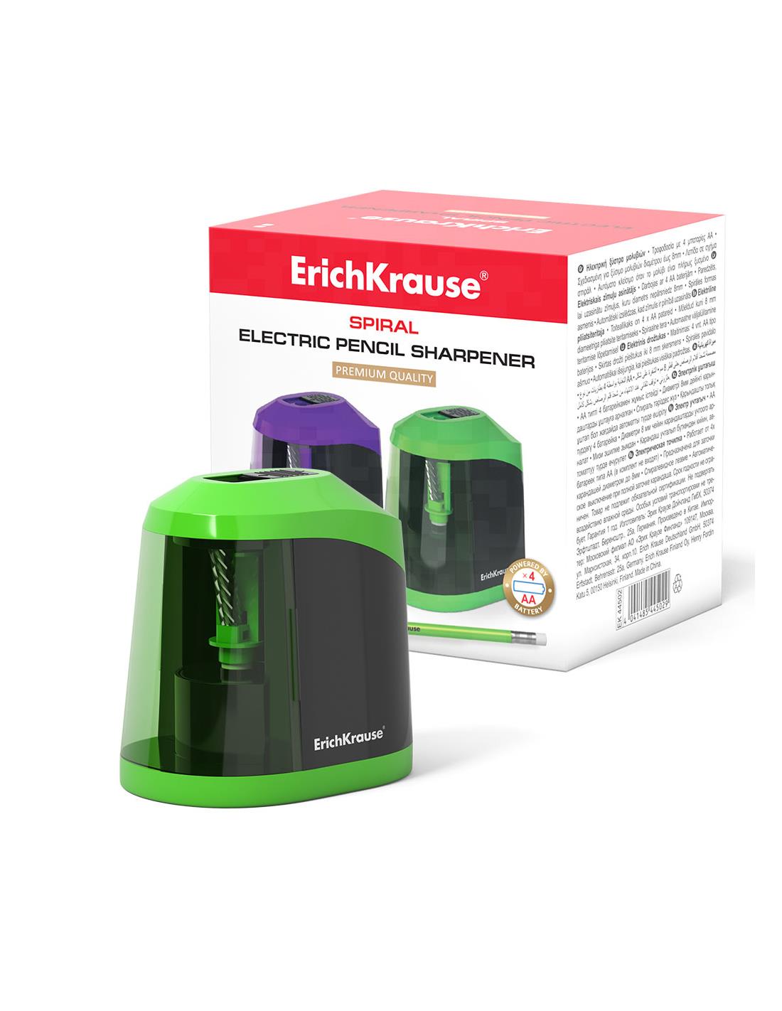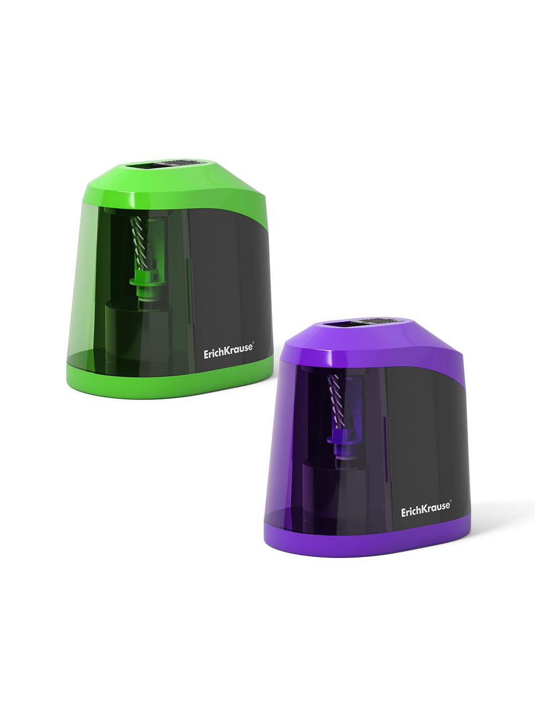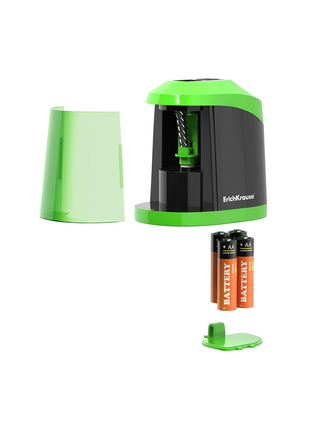 Sacapuntas electrico con el contenedor para las virutas. Apagado automatico cuando el lapiz esta totalmente afilado. Alimentado por 4 pilas AA. Sacapuntas con un orificio de 8 mm de diametro para afilar lapices estandares de grafito negro y de color. Cuchilla niquelada de acero al carbono en forma de espiral de alta calidad.