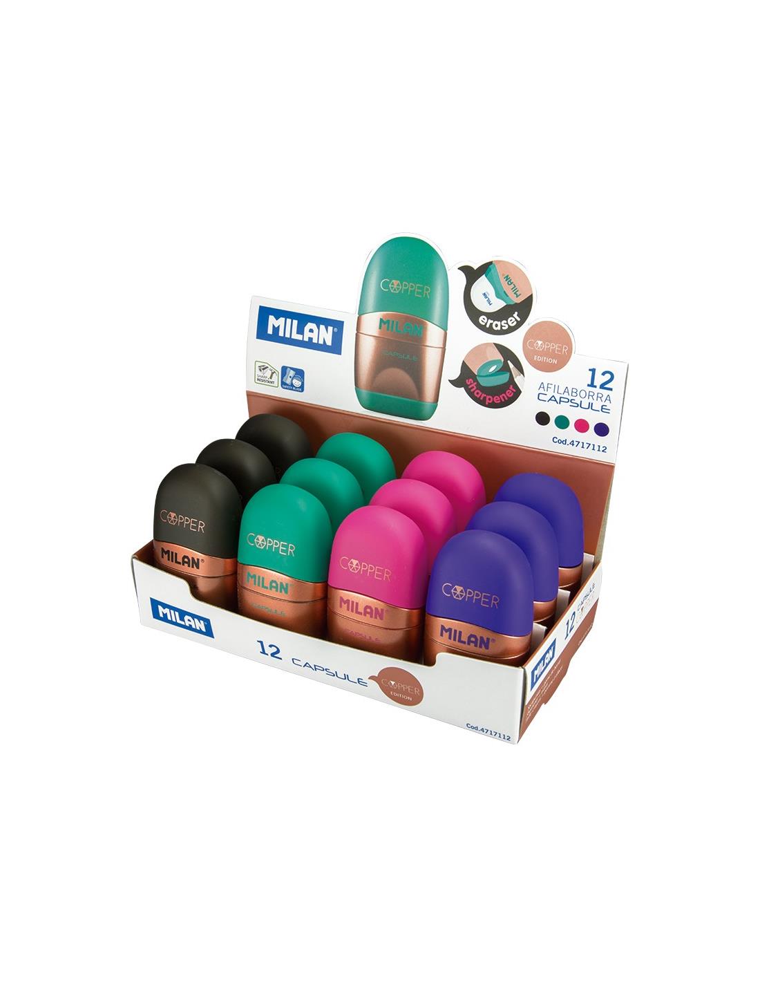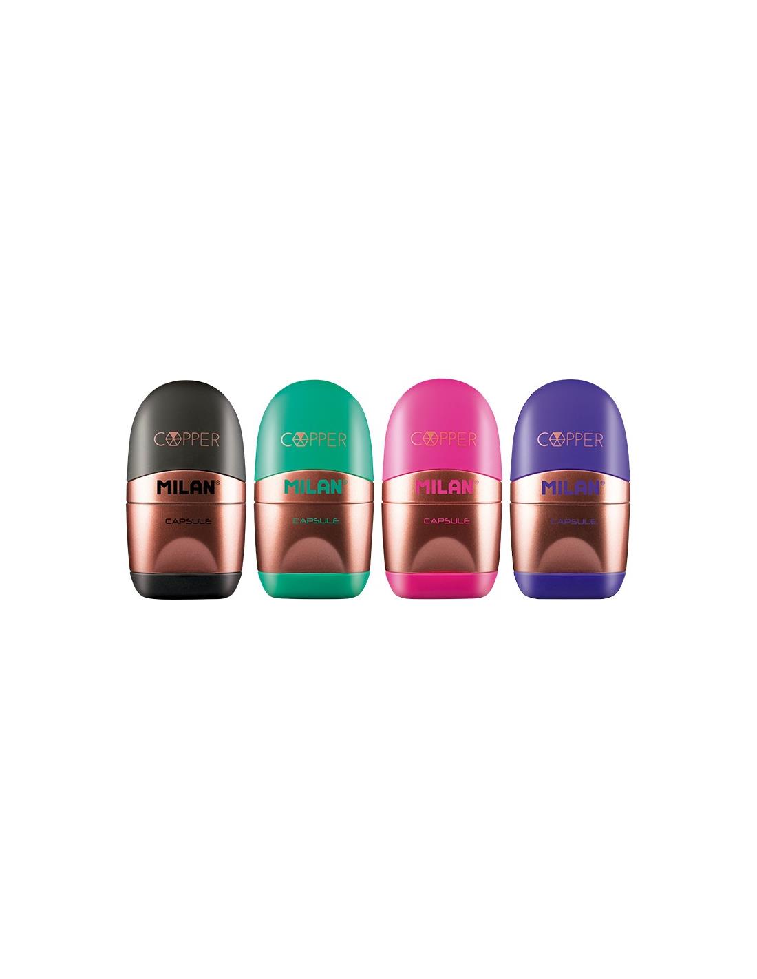 Combinación de goma de borrar y sacapuntas con depósito. Diseño CAPSULE serie Copper. El sacapuntas dispone de una cuchilla de acero afilada y resistente, ideal para todo tipo de lápices. Sacapuntas con cuchilla de seguridad: este sistema evita que se pueda separar la hoja del cuerpo del sacapuntas. Diseño original creado por el departamento de I+D de MILAN. Colores surtidos disponibles: negro, rosa, lila y verde. Gomas de borrar de recambio disponibles.