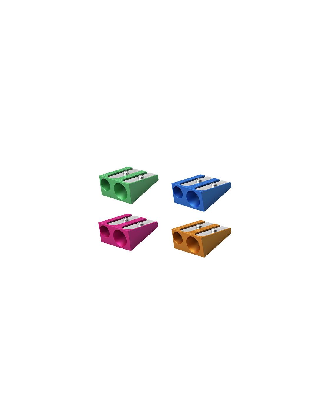 Sacapuntas metalico en colores brillantes con una zona de agarre ergonomica. Sacapuntas clasico con dos agujeros, de 8 mm y 11 mm de diametro, para afilar lapices estandares y gruesos (Jumbo). Cuchilla niquelada de acero al carbono en forma de espiral de alta calidad.