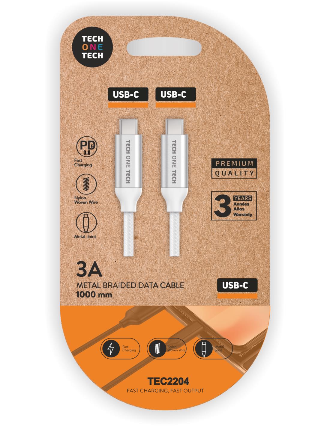 Cable USB-C power delivery con conexión USB-C a USB-C. ¿Sabías que el cable tiene un papel fundamental en el rendimiento del cargador? Cable de datos y carga rápida de nylon, recubierto, trenzado y reforzado. Anti-torsión y abrasión. Conectores y uniones metalizados para una mayor resistencia y durabilidad. 3A. 1 mt. de longitud y 30 gr. de peso. Compatibilidad : Cable aprobado para carga y datos en dispositivos con conexión USB-C. Válido para móviles, tablets, auriculares, etc. Usalo junto con : TEC2251 - Cargador PD 3.0 blanco, Ultrarrápido 20W. Power Delivery. Salida USB-C Normativas y seguridad : Cumple con las normas de CE, FCC y ROHS. Multi-protecciones contra sobrecarga y cortocircuito previenen efectivamente los posibles daños a tus dispositivos . Garantía : 3 AÑOS. La más alta calidad del mercado con la mayor garantía. Productos pensados para durar.