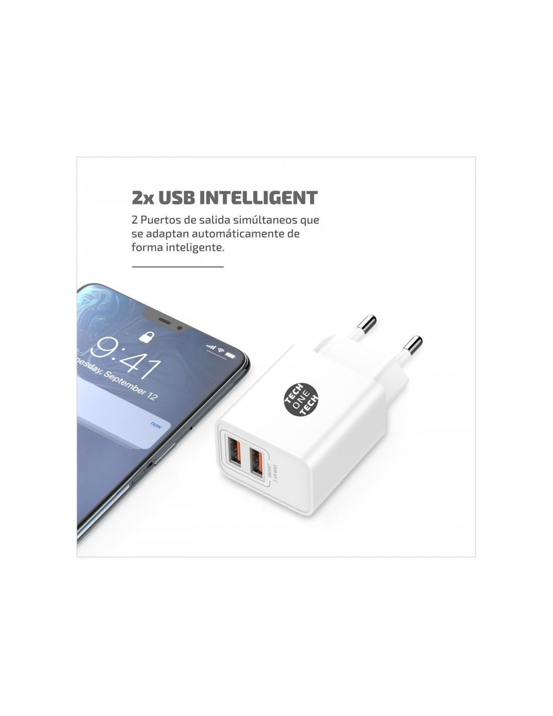 2 puertos de salida que se adaptan automáticamente a la corriente requerida para la carga, 2,4A cuando cargamos un solo dispositivo y 1A cuando cargamos 2 dispositivos simultáneamente.