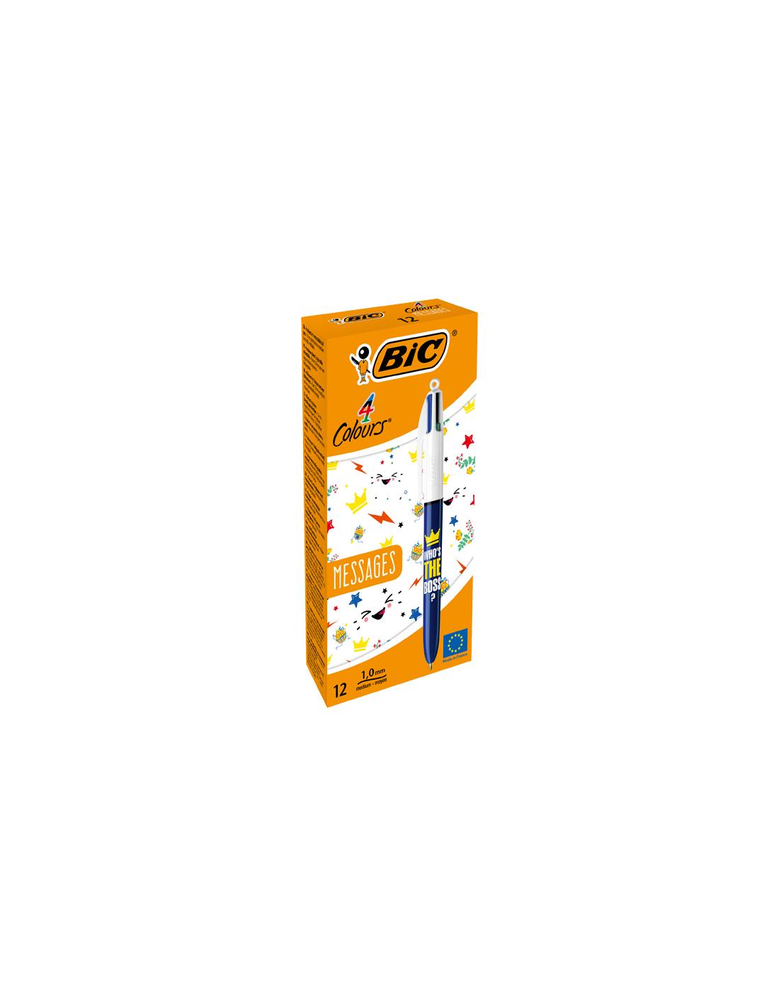 Bolígrafo Bic 4 colores messages. Bolígrafo con cuatro colores: azul, verde, rojo y negro. El cuerpo del bolígrafo presenta distintos mensajes con humor, que los hace una opción de escritura muy divertida. Gracias a sus 4 cartuchos de tinta pueden llegar a escribir hasta 8 km. Las puntas son de 1 mm.