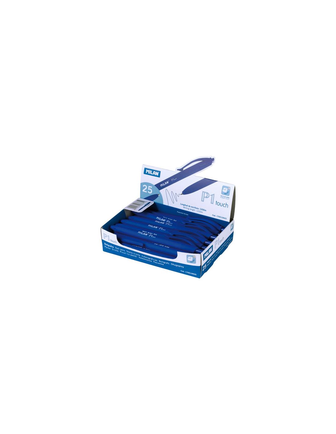 Bolígrafo P1 Touch azul, con el cuerpo del mismo color que la tinta. Longitud de escritura aproximada de 1.200 metros. Punta 1 mm. Tinta fabricada en Alemania. Diseño original creado por el departamento de I+D de Milan. Medidas bolígrafo: 14,1 x 1,7 cm. Diámetro: 1 cm.