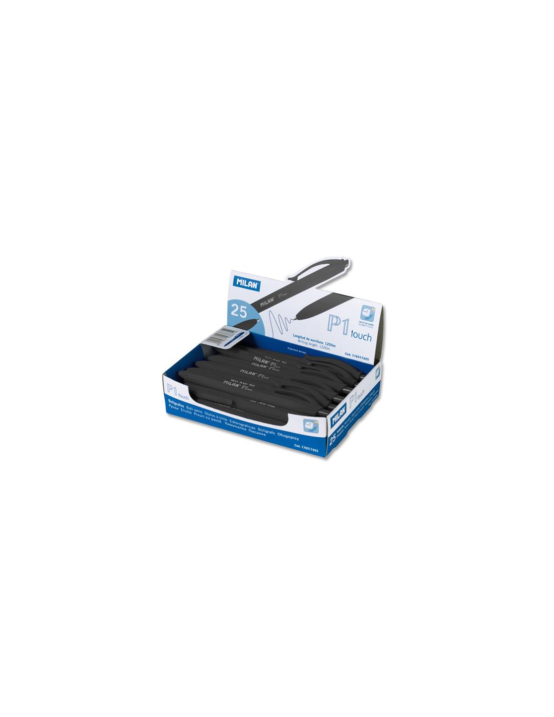 Bolígrafo P1 Touch negro, con el cuerpo del mismo color que la tinta. Longitud de escritura aproximada de 1.200 metros. Punta 1 mm. Tinta fabricada en Alemania. Diseño original creado por el departamento de I+D de Milan. Medidas bolígrafo: 14,1 x 1,7 cm. Diámetro: 1 cm.