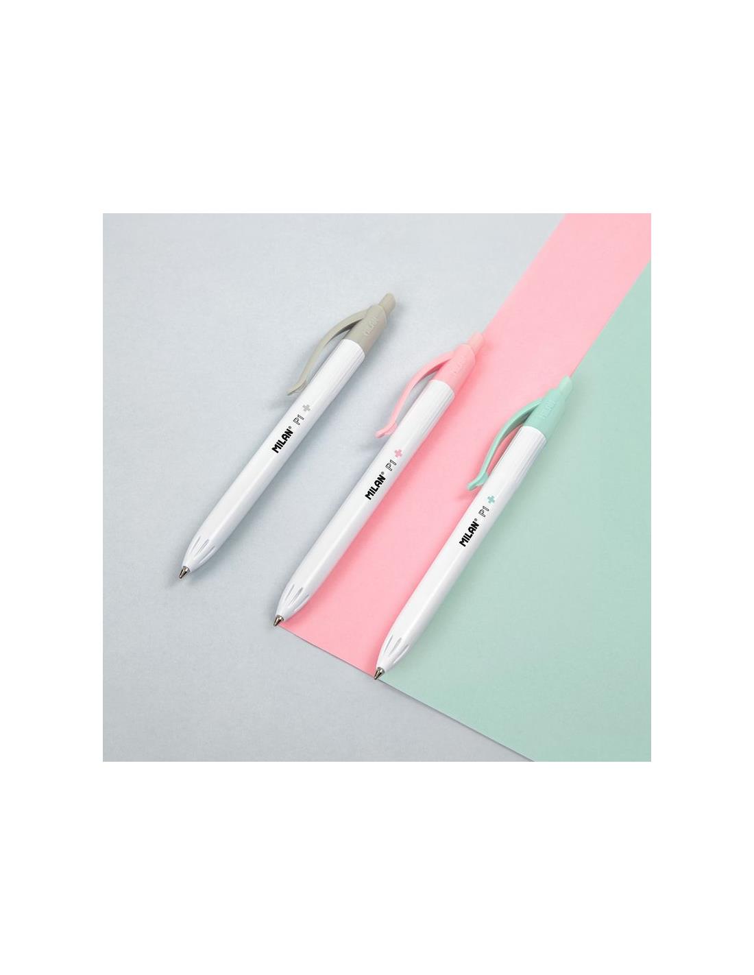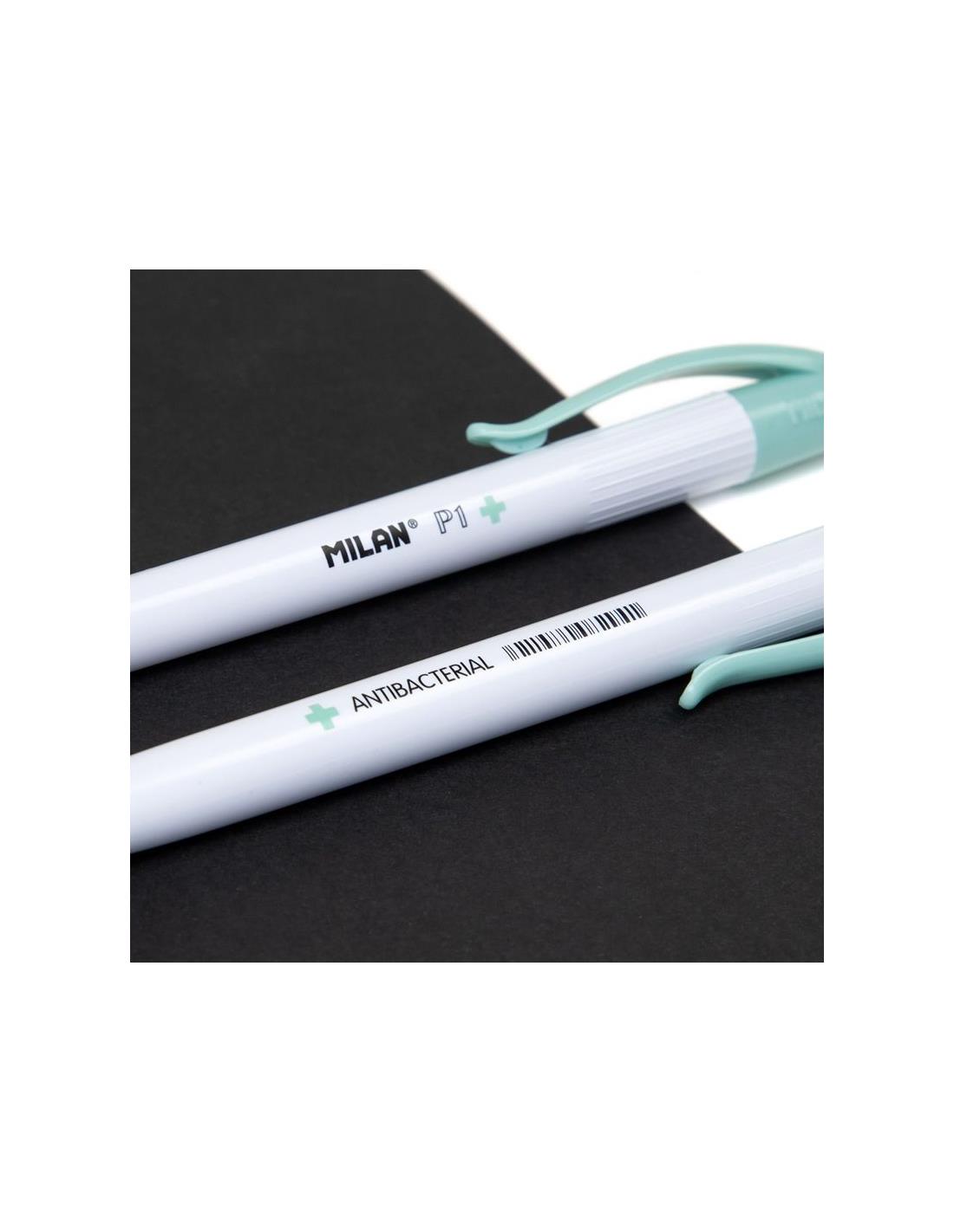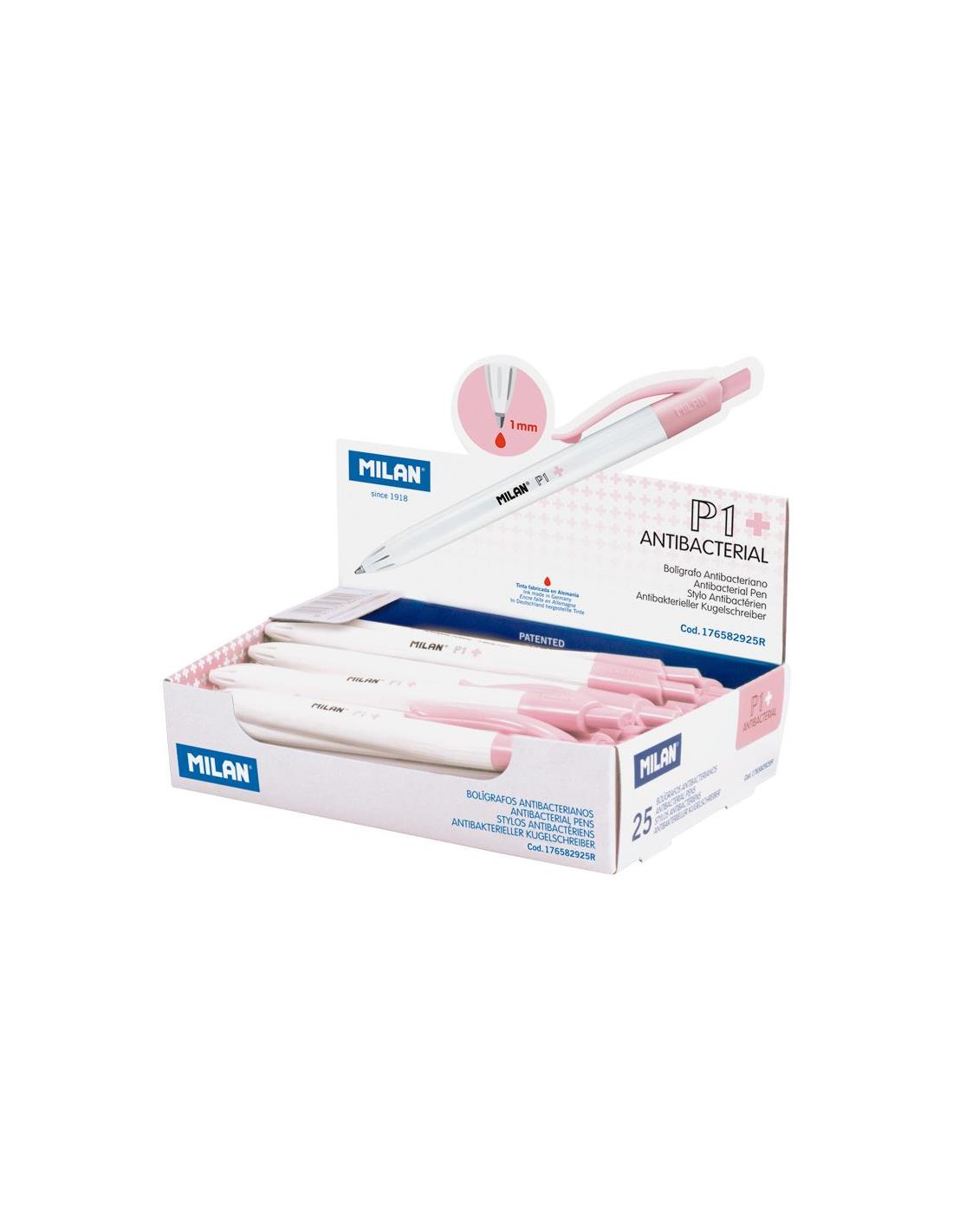 Caja expositora 25 bolígrafos Milan P1 tinta roja Edición +. El bolígrafo incorpora un biocida ensu superficie. Tratado con vidrio de fosfato de plata (CAS 308069-39-8)con efecto antibacteriano. Ideal para mejorar la higiene en la escuela, oficina, ambientes en contacto conalimentos y entornos sanitarios. Cuerpo de color blanco con pinza y botón de color turquesa. Longitud de escritura aproximada de 1.200 metros. Punta 1 mm. Tinta fabricada en Alemania. Diseño original creado por el departamento de I+D de MILAN. Medidas bolígrafo: 14,1 x 1,7 cm. 1 cm Ø.