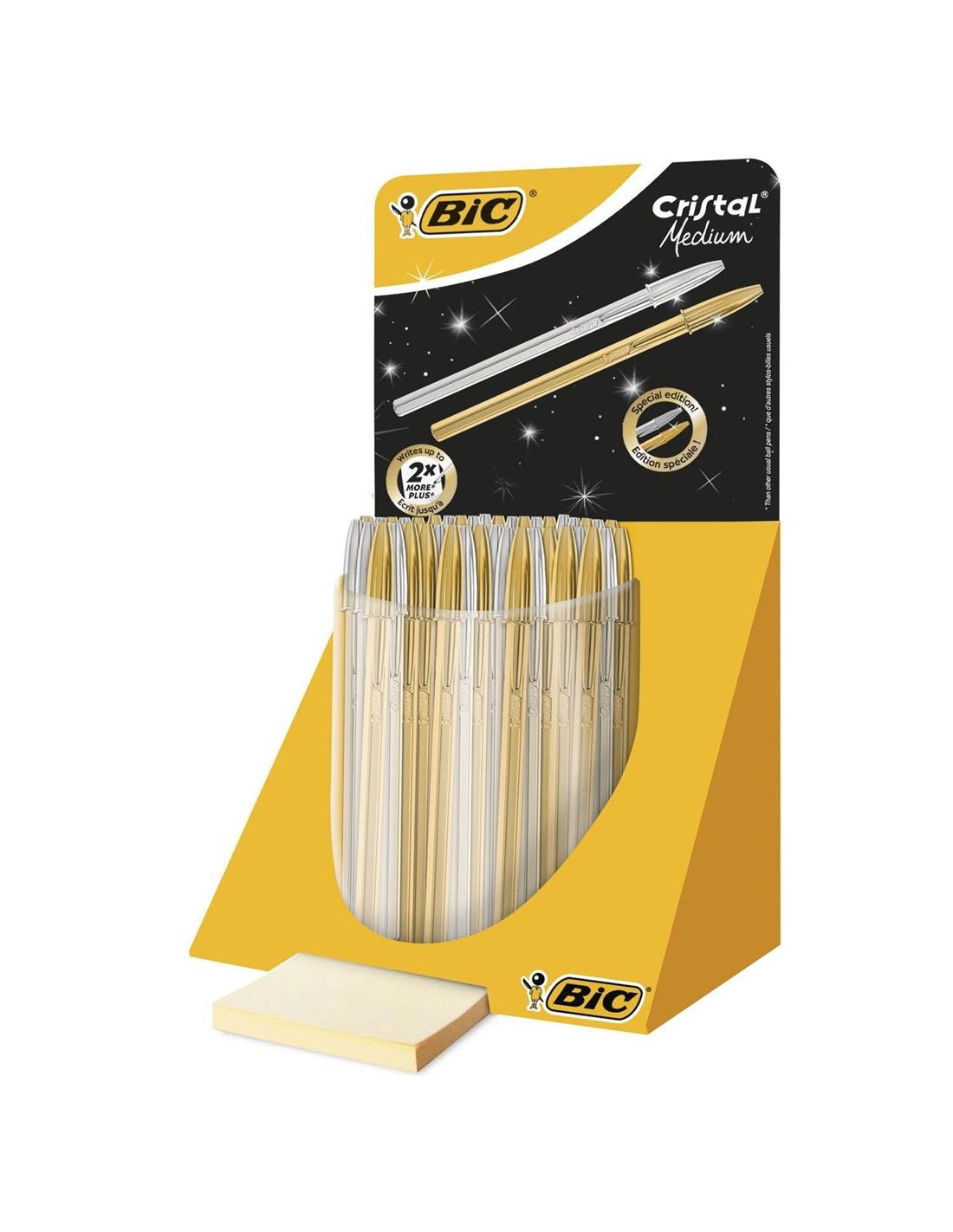 Expositor con 40 unidades de bolígrafos Bic cristal, edición especial, oro y plata. Escritura azul (oro) y escritura negra (plata).
