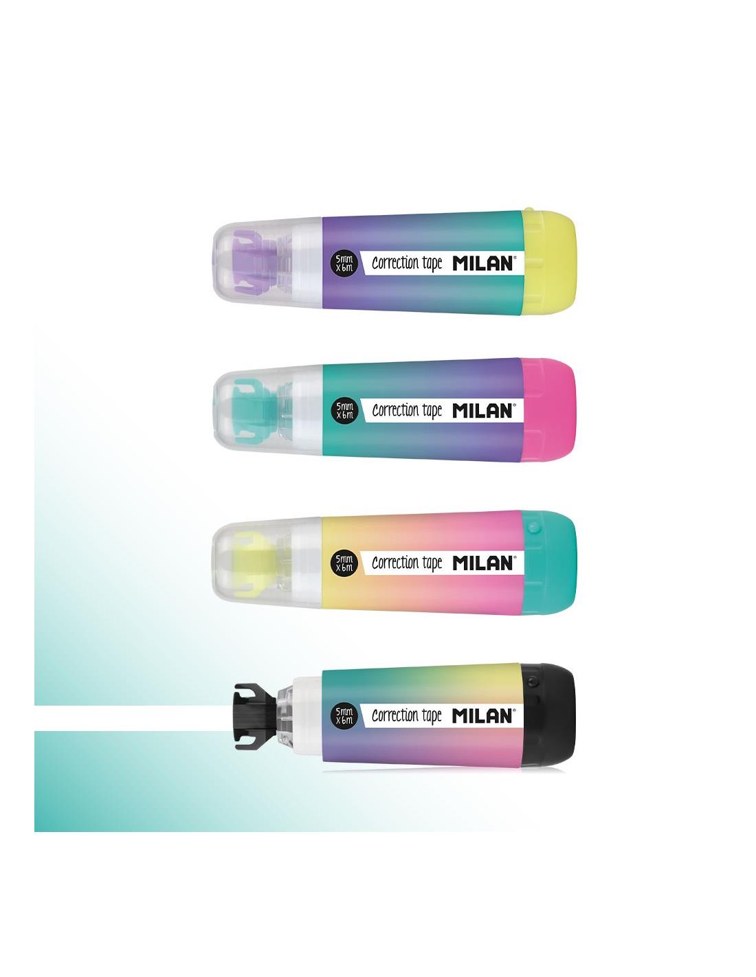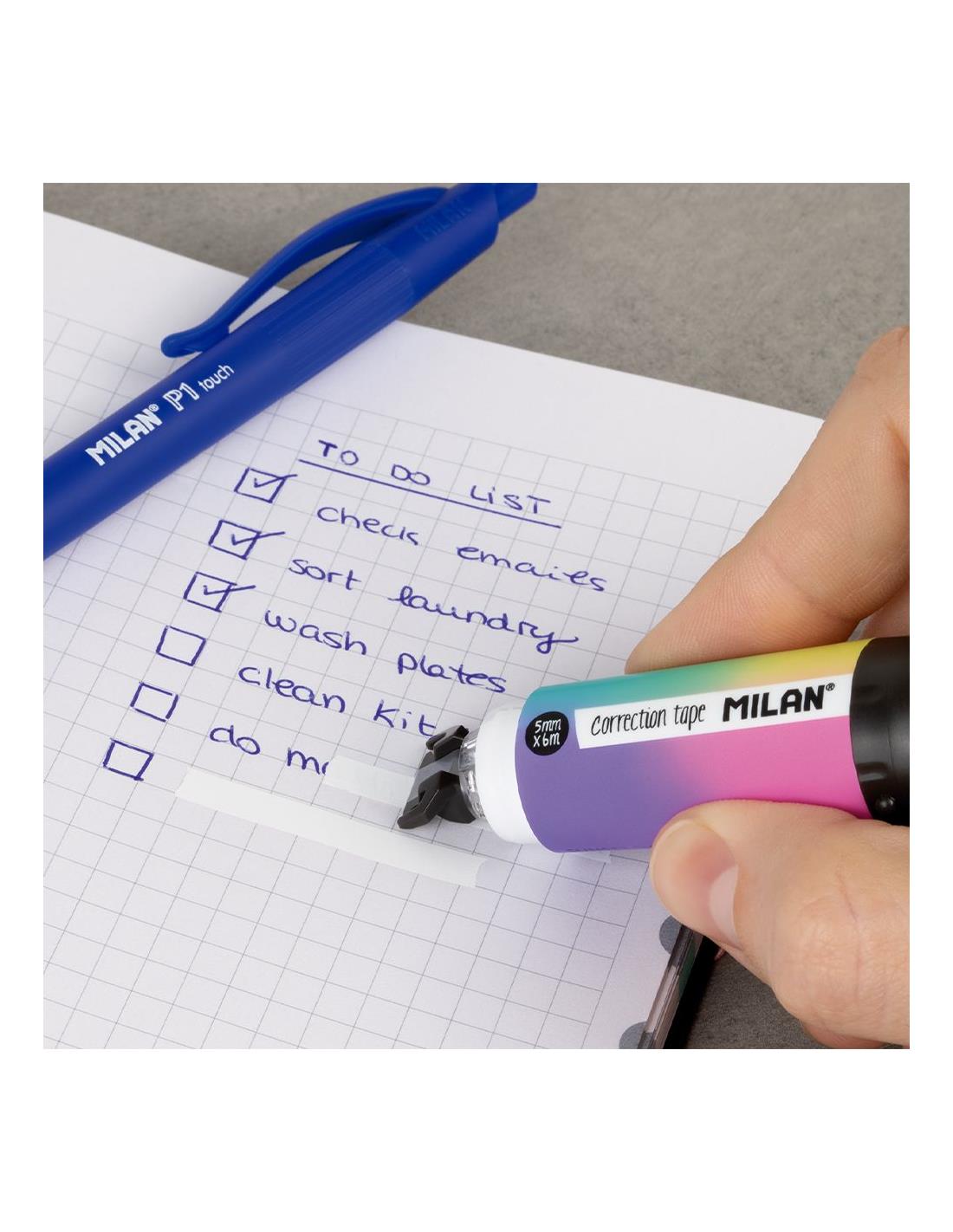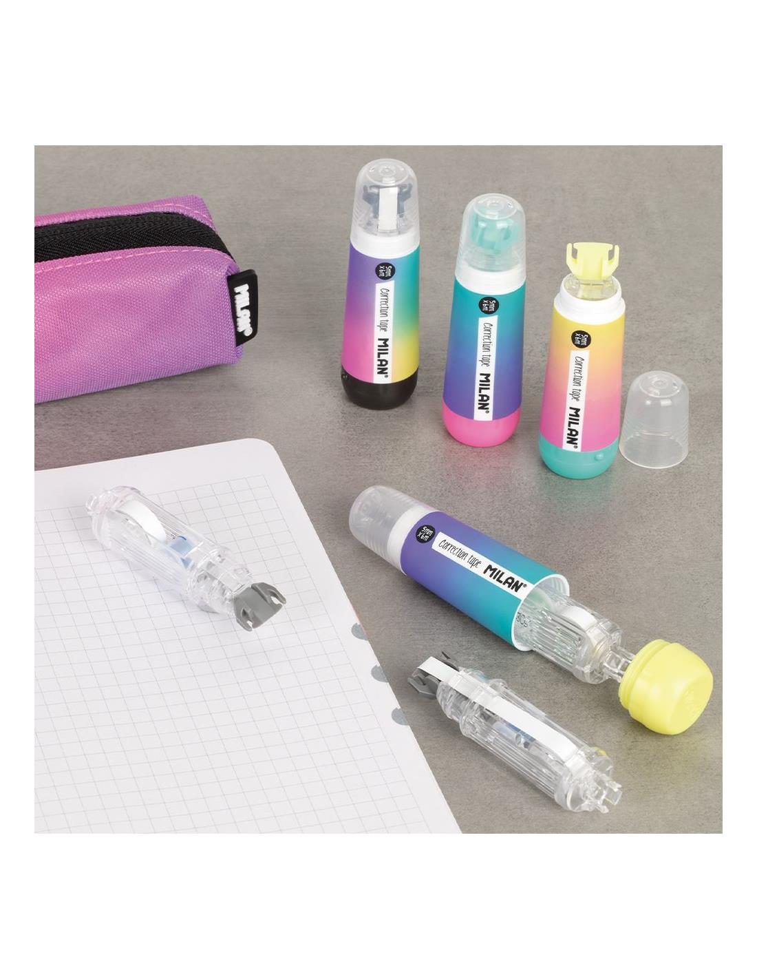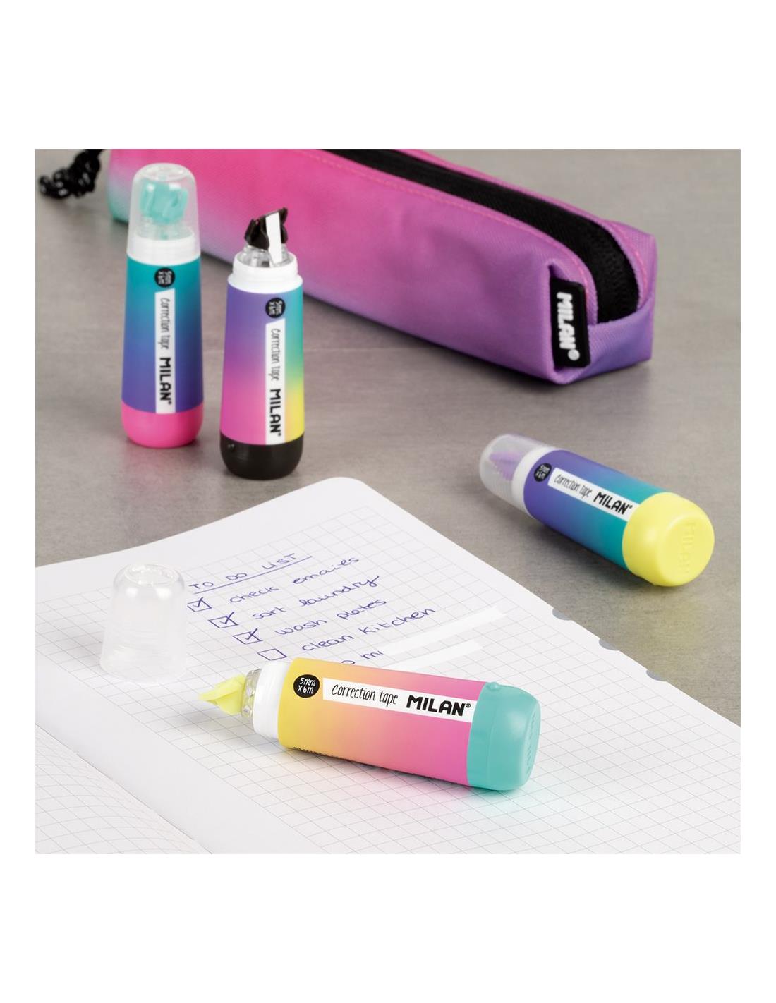Cinta correctora en seco cilíndrica, serie Sunset. Apta para zurdos gracias a la rotación de 360º de su punta. Rápida, limpia y precisa. Correcciones sobre todo tipo de papel, no deja marcas en fotocopias o fax. 5 mm de ancho x 6 m de largo. Colores surtidos: negro, verde, rosa y amarillo. Serie Sunset: una combinación de colores degradados inspirados en el atardecer, acompañados de detalles en blanco y negro. Recambios de la cinta correctora disponible en formato blíster ref. BWM10467.