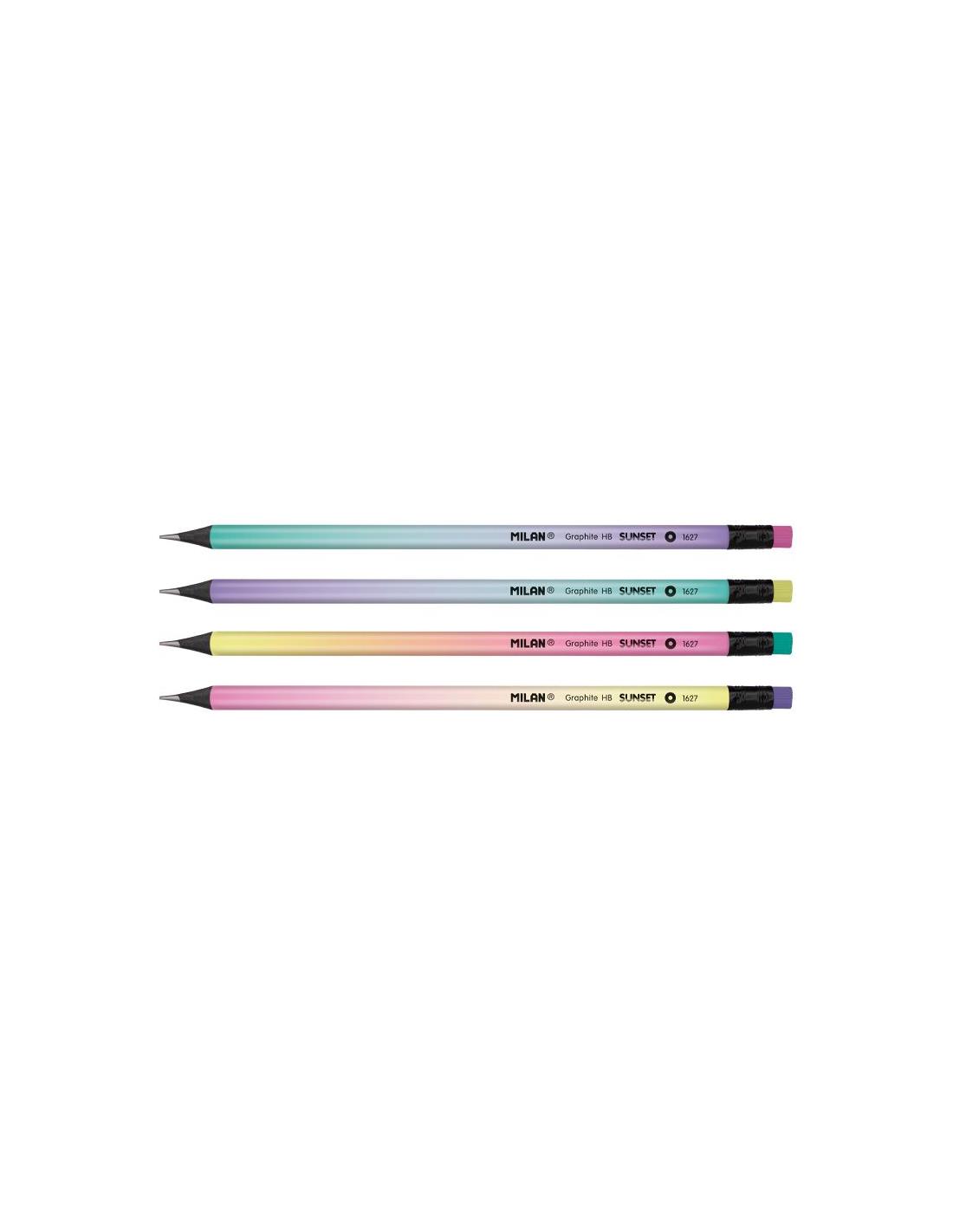 Lápices de grafito HB serie Sunset, de manera negra de tilo y goma de borrar de colores (amarillo, lila, rosa y turquesa). Sección redonda, mina de 2,2 mm Ø. La graduación HB es una dureza de grafito media, recomendada para escritura y dibujo. La mina ofrece un trazo uniforme y es resistente a la rotura, gracias al sistema LPS (Lead Protection System) que protege la mina por su adhesión con la madera. Madera procedentede plantaciones sostenibles. Contiene 6 lápices de cada color (amarillo, lila, rosa y turquesa).