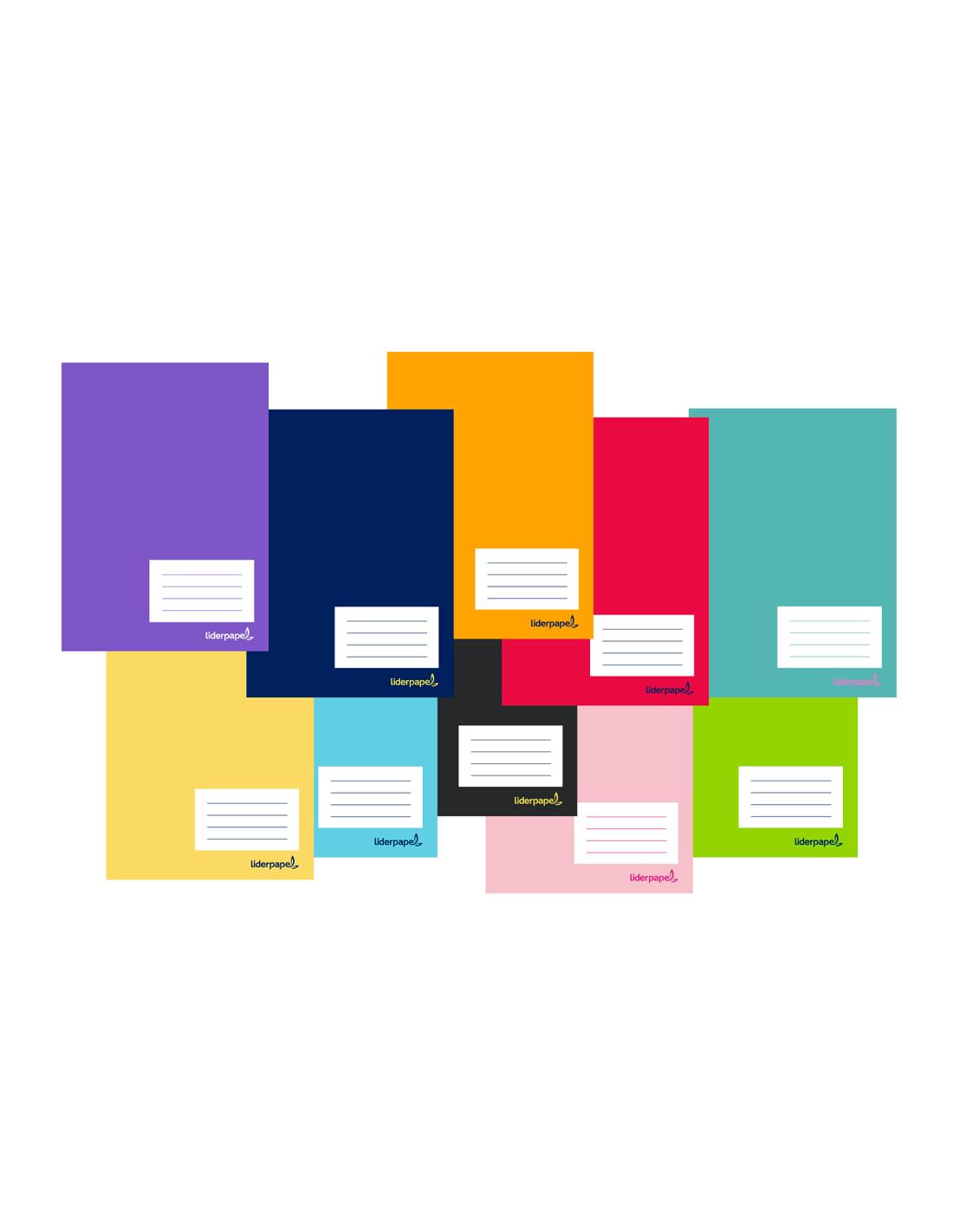 Tapa de 250 g/m² fabricada en cartoncillo impreso y plastificado brillo. Papel de 60 g/m². Contienen etiqueta en la portada para rellenar con datos. Con margen. Colores surtidos.