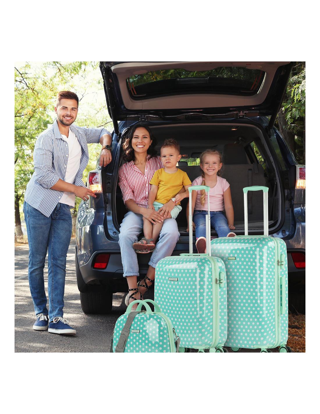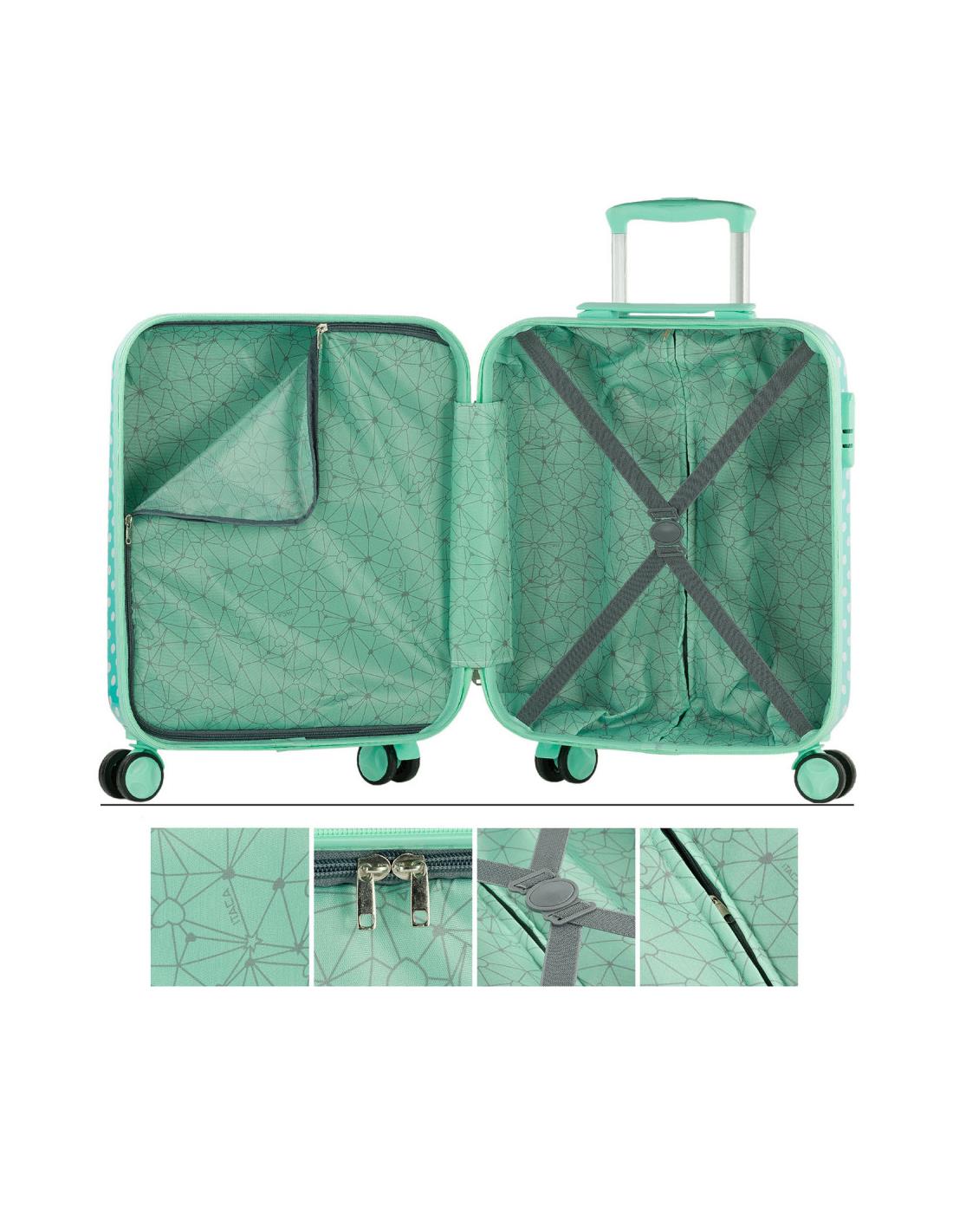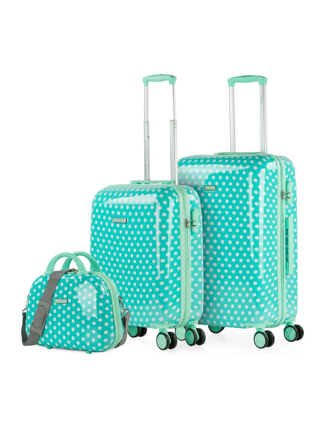 Juego de 2 maletas y neceser juveniles de la firma ITACA. Los productos ITACA siempre están a la última en diseño. ITACA está comprometida con la calidad en todos sus productos. Nuestros productos están diseñados para ofrecerte el máximo confort en tus viajes. Este set de 2 maletas te ofrece una combinación ideal para viajes de hasta 2 semanas. ITACA. Tu fiel compañero de viaje. Características principales Dimensiones b>Cabina (Cumple la normativa de equipaje de mano de EasyJet, Iberia, Ryanair, etc.) Total: 55x40x20 cm Cuerpo: 48x39x20 cm Peso: 2,65 kg Grande Total: 65x44x25 cm Cuerpo: 58x42x25 cm Peso: 3,45 kg Exterior Material: Policarbonato PC estampado. Cierre: Candado integrado de 3 dígitos. Cremallera: De doble cursor con orificios para candado. Deslizamiento muy suave