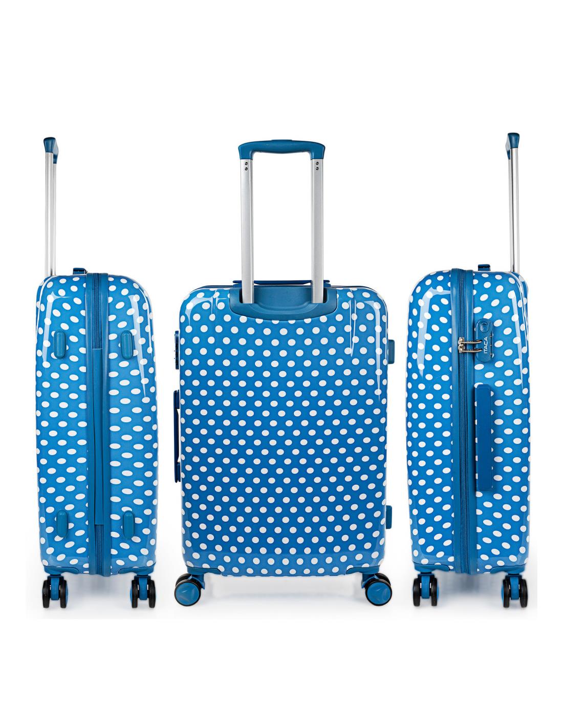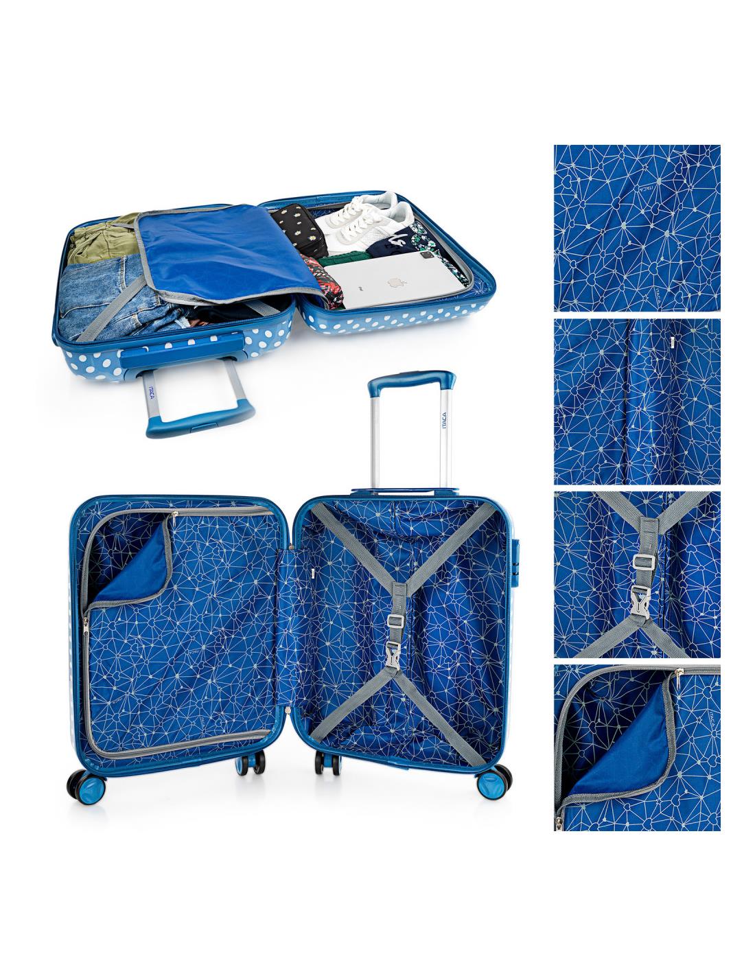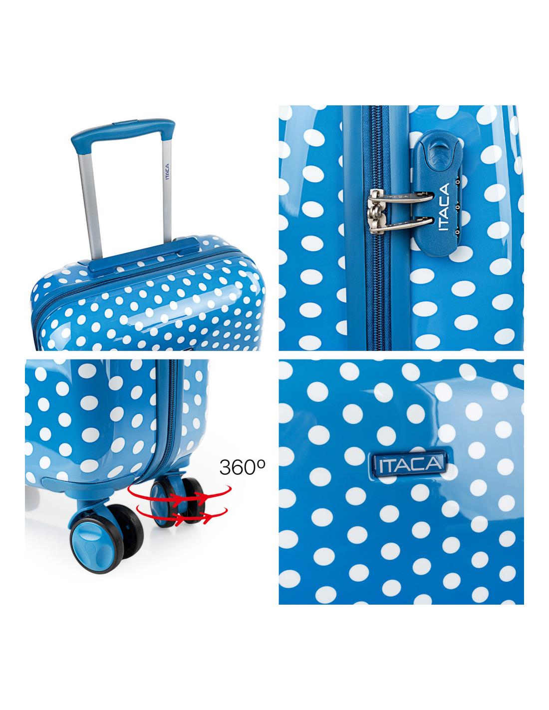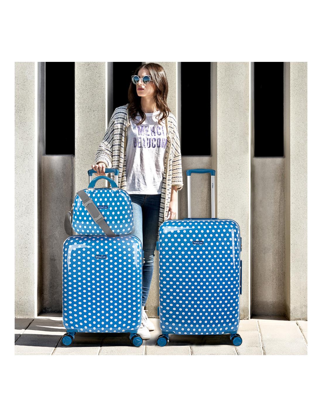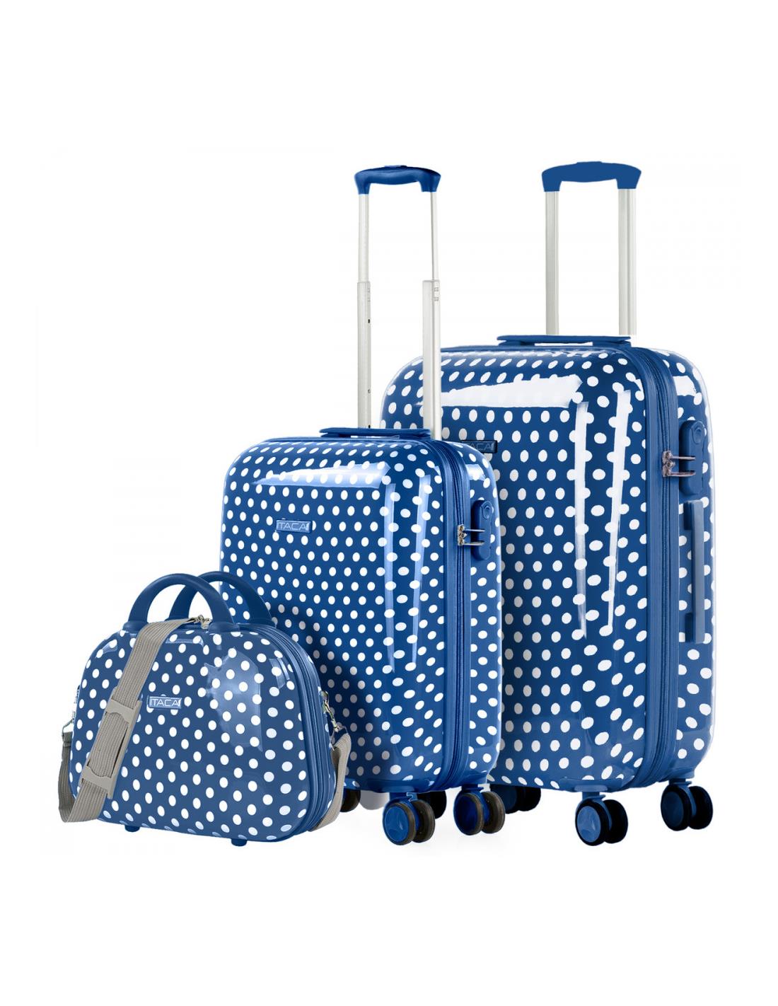 Juego de 2 maletas y neceser juveniles de la firma ITACA. Los productos ITACA siempre están a la última en diseño. ITACA está comprometida con la calidad en todos sus productos. Nuestros productos están diseñados para ofrecerte el máximo confort en tus viajes. Este set de 2 maletas te ofrece una combinación ideal para viajes de hasta 2 semanas. ITACA. Tu fiel compañero de viaje. Características principales Dimensiones b>Cabina (Cumple la normativa de equipaje de mano de EasyJet, Iberia, Ryanair, etc.) Total: 55x40x20 cm Cuerpo: 48x39x20 cm Peso: 2,65 kg Grande Total: 65x44x25 cm Cuerpo: 58x42x25 cm Peso: 3,45 kg Exterior Material: Policarbonato PC estampado. Cierre: Candado integrado de 3 dígitos. Cremallera: De doble cursor con orificios para candado. Deslizamiento muy suave
