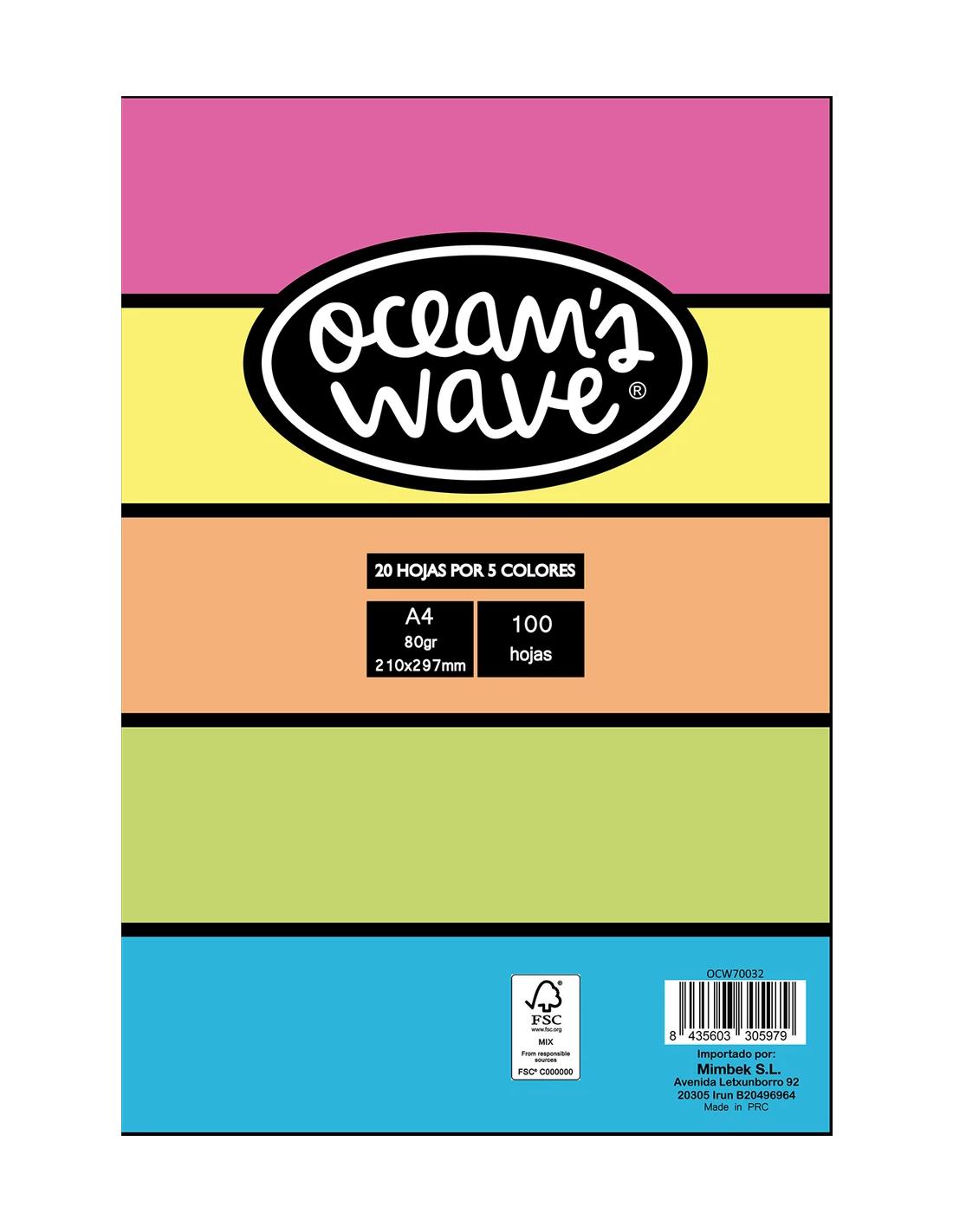 Pack de 100 hojas Ocean's Wave. 5 colores flúor. Papel 80gr en A4.
