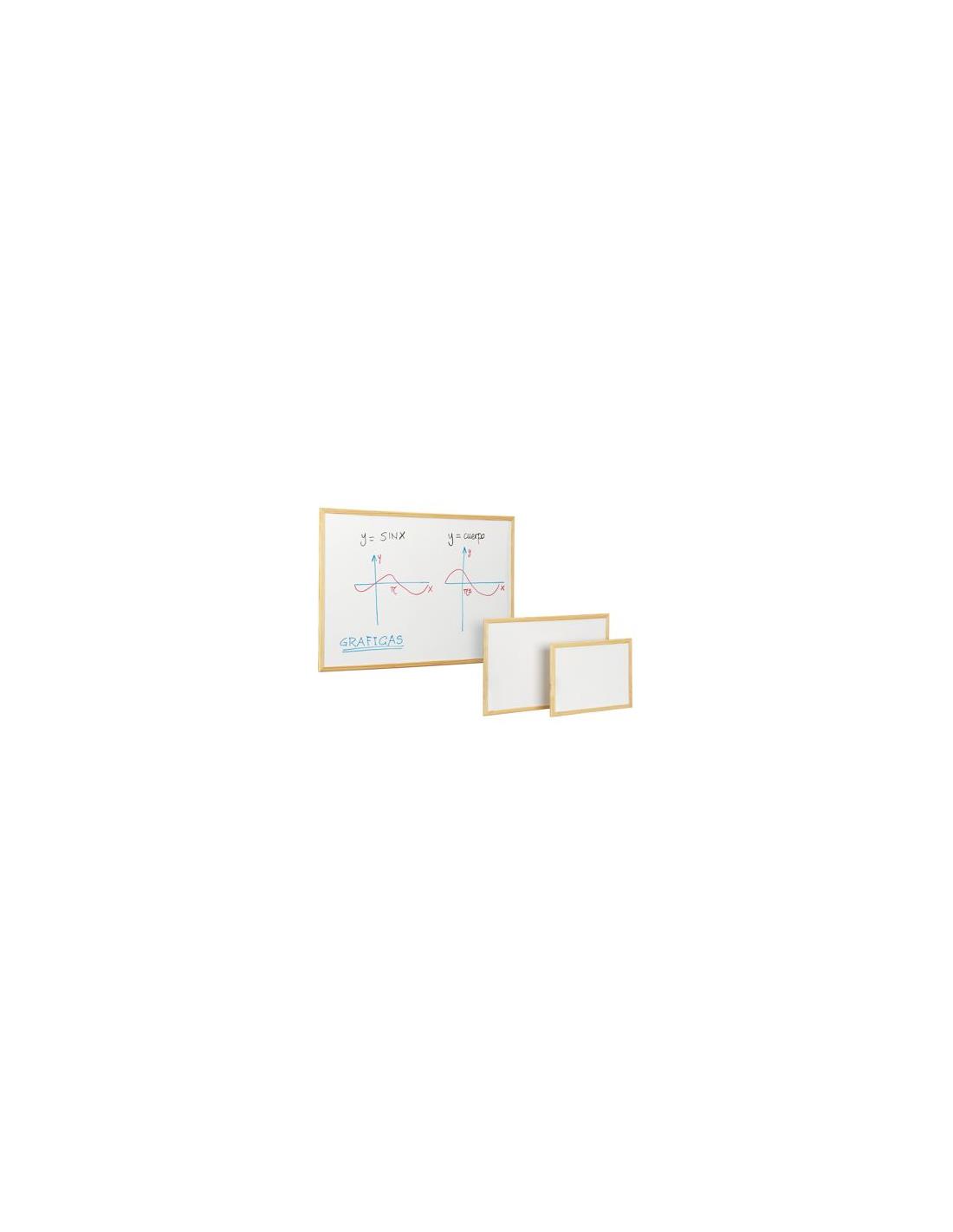 Pizarra blanca, con dimensiones 60 x 90 cm. Posee marco de madera de pino y es 100% reciclable.