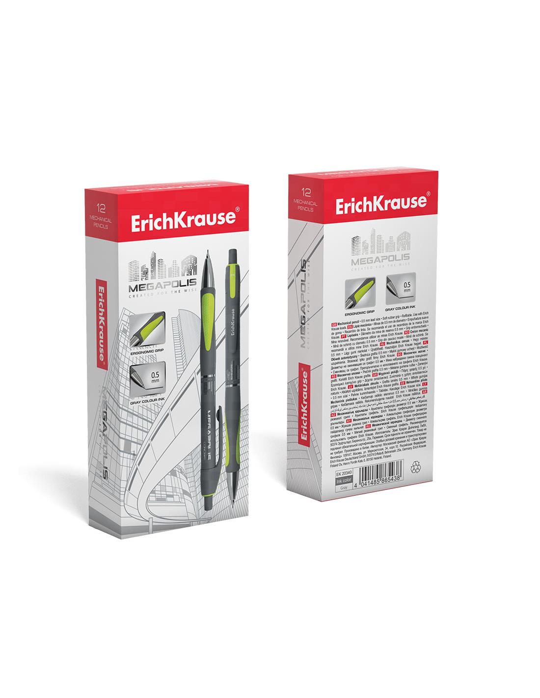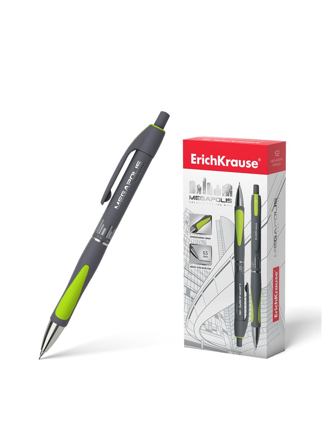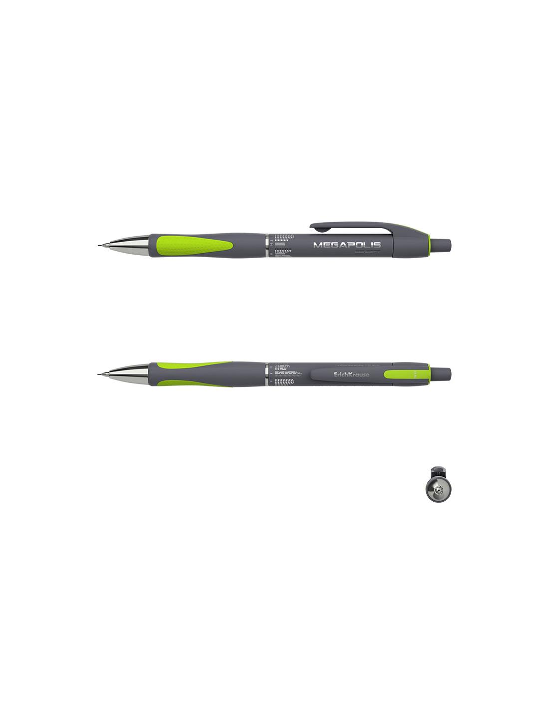 Lapiz mecanico con punta de metal y boquilla retractil. El lapiz mecanico tiene una carcasa redonda y brillante con una zona de agarre ergonomica, equipada con dos bordes de goma en colores neon. Dureza HB. Minas de 0.5 mm de diametro. El modelo MEGAPOLIS CONCEPT tiene una forma patentada y reconocible, asi como excelentes cualidades ergonomicas. Se ha convertido en uno de los lapices mecanicos mas vendidos de ErichKrause.