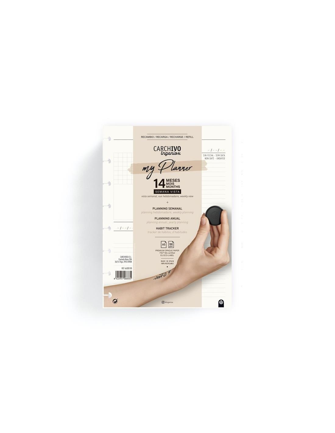 Optimiza tu planificación diaria con el Recambio MyPlanner A5 compatible con la gama CARCHIVO Ingeniox®. Este recambio de 144 páginas de papel premium opaco de 100g, certificado FSC® Mix y EU ECO-LABEL, combina sostenibilidad con la máxima calidad. Diseñado para una gestión eficiente del tiempo, incluye herramientas clave para tu organización personal.