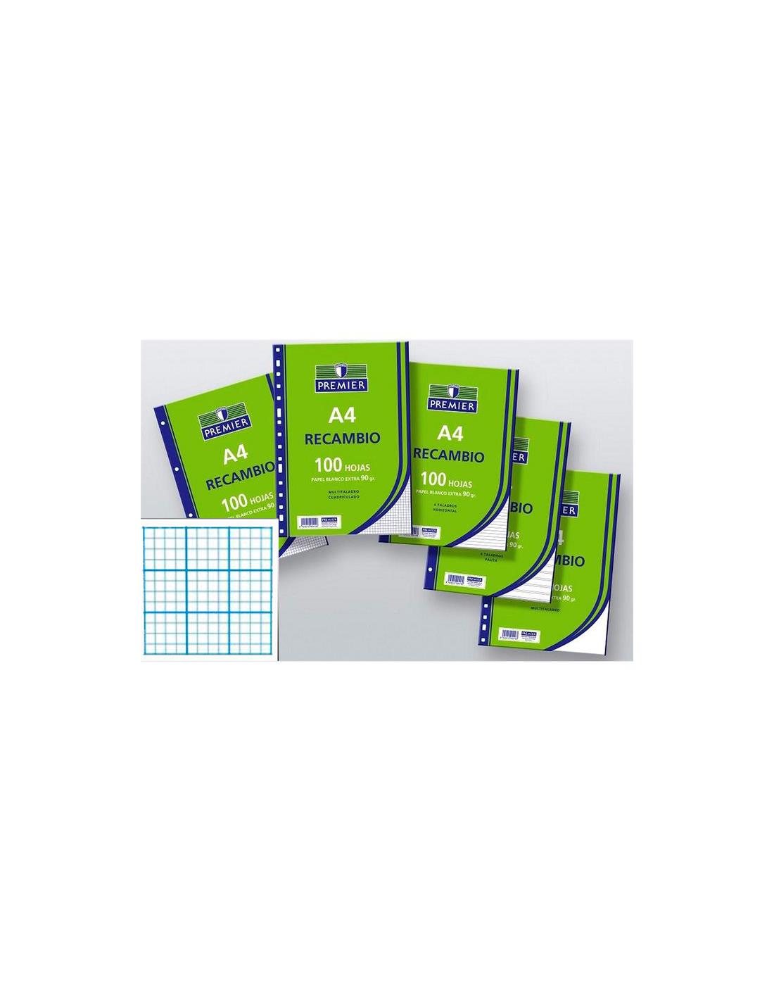 Recambio de 100 hojas A4 de papel extra blanco de 90grs, 4 taladros y milimetrado.