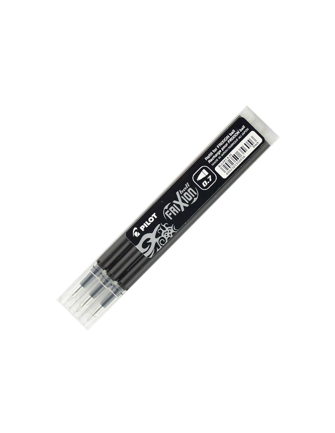 Recambio para bolígrafos pilot frixion ball clicker. Tres colores disponibles: azul, negro y rojo. Punta de 0,7 mm. Trazo de 0,4 mm. El estuche de 3 recambios.