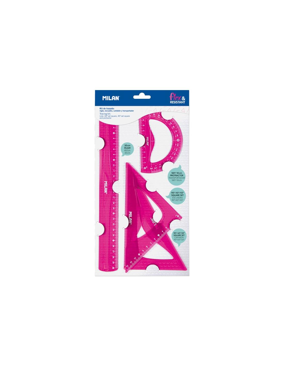 Kit de trazado Flex&Resistant: regla 30 cm, escuadra 90º / 45º / 45º, cartabón 90º / 60º / 30º y transportador 180º 10 cm. Color rosa translúcido, serie Acid. Material flexible y resistente.