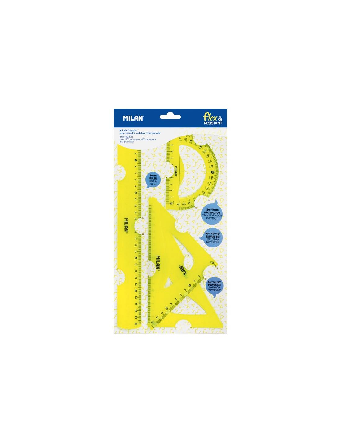 Kit de trazado Flex&Resistant: regla 30 cm, escuadra 90º / 45º / 45º, cartabón 90º / 60º / 30º y transportador 180º 10 cm. Color amarillo translúcido, serie Acid. Material flexible y resistente.