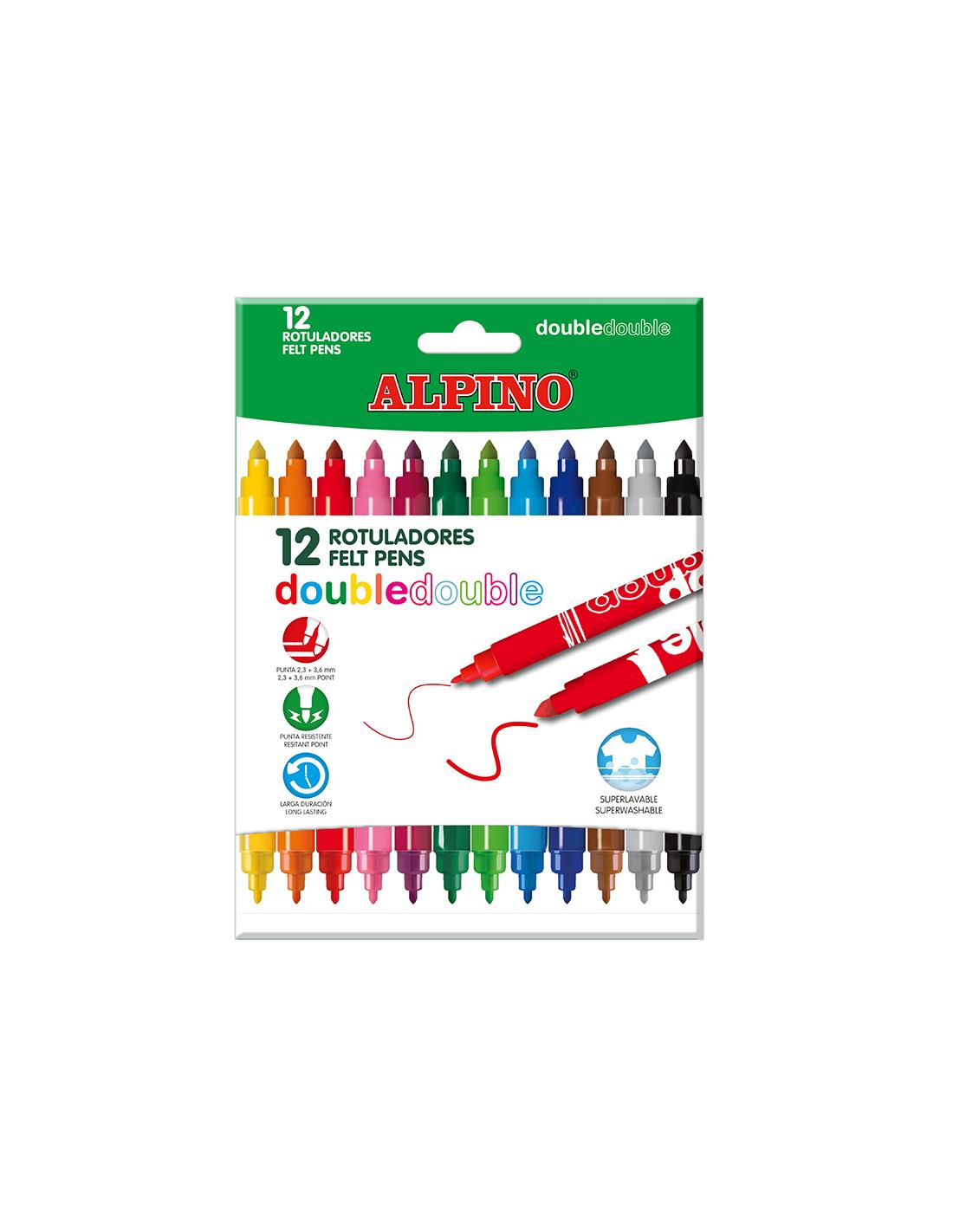Rotuladores de doble punta caja 12 unidades. Tú eliges: pinta grueso o pinta fino con un mismo rotulador. Los colores son superbrillantes y además la tinta es superlavable. Son ideales tanto para trabajos escolares como para pintar dibujos o mandalas ya que permiten rellenar grandes superficies con la punta gruesa y perfilar detalles con la punta final.