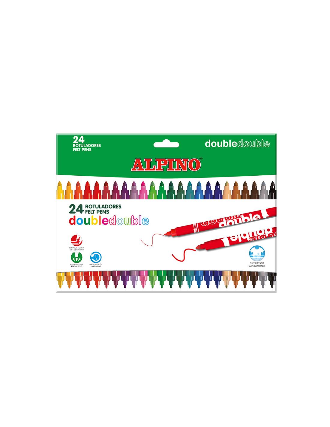 Rotuladores de doble punta caja 24 unidades. Tú eliges: pinta grueso o pinta fino con un mismo rotulador. Los colores son superbrillantes y además la tinta es superlavable. Son ideales tanto para trabajos escolares como para pintar dibujos o mandalas ya que permiten rellenar grandes superficies con la punta gruesa y perfilar detalles con la punta final.