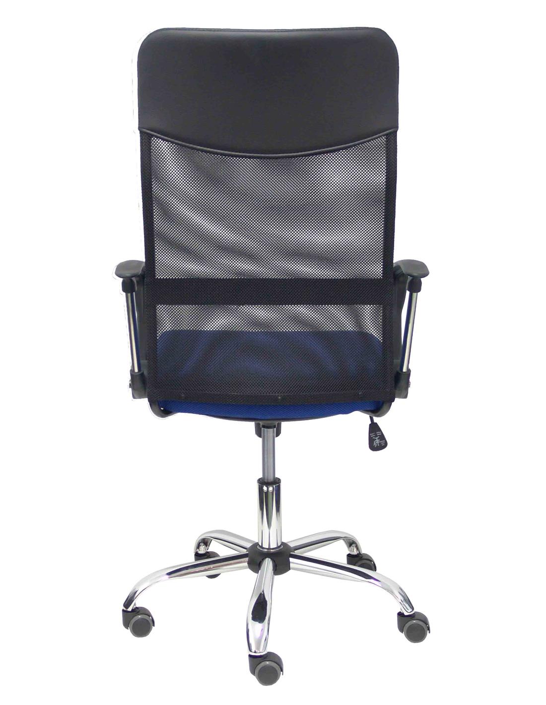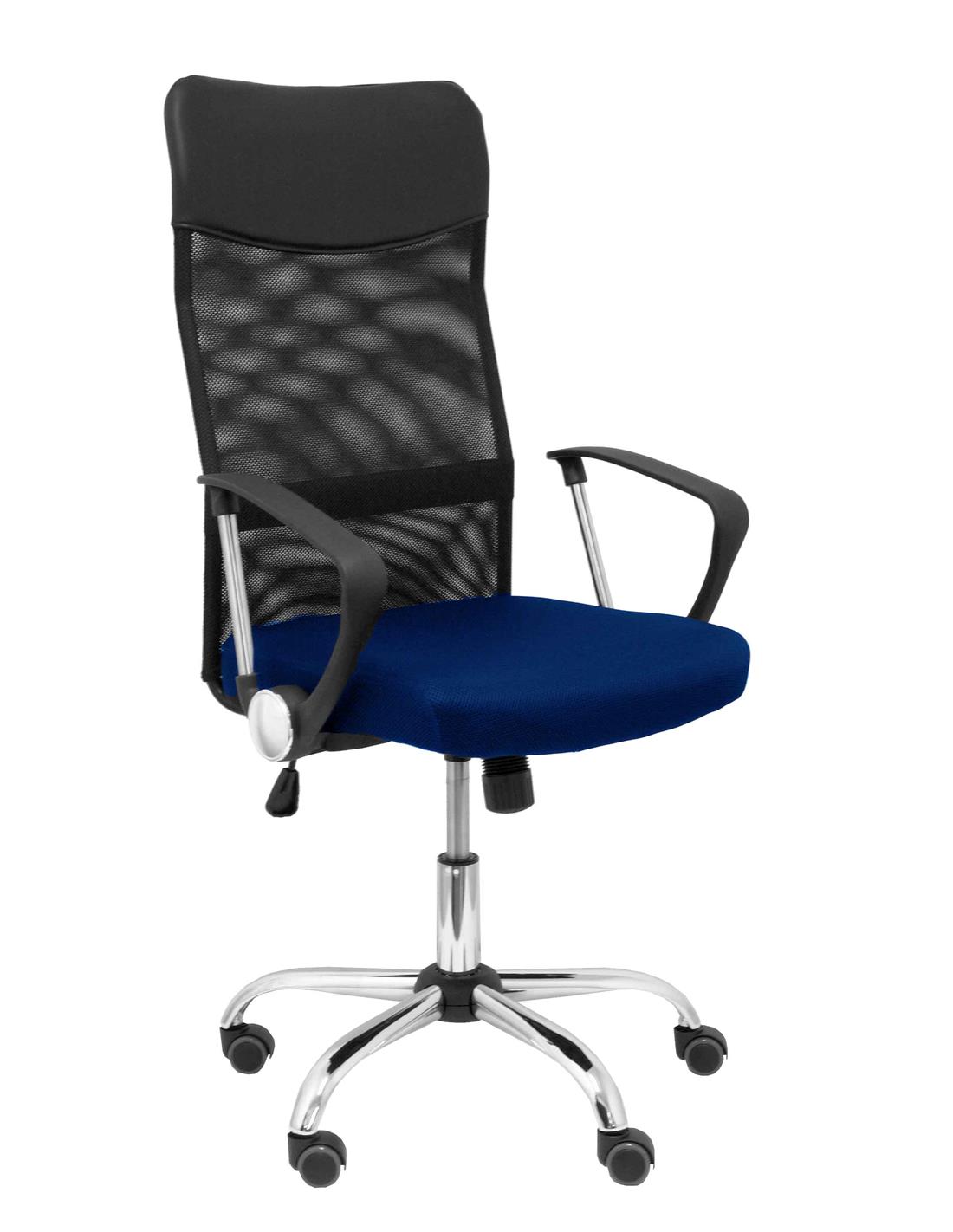 Respaldo de malla de nailon color negro y asiento tapizado en tejido de malla color azul.