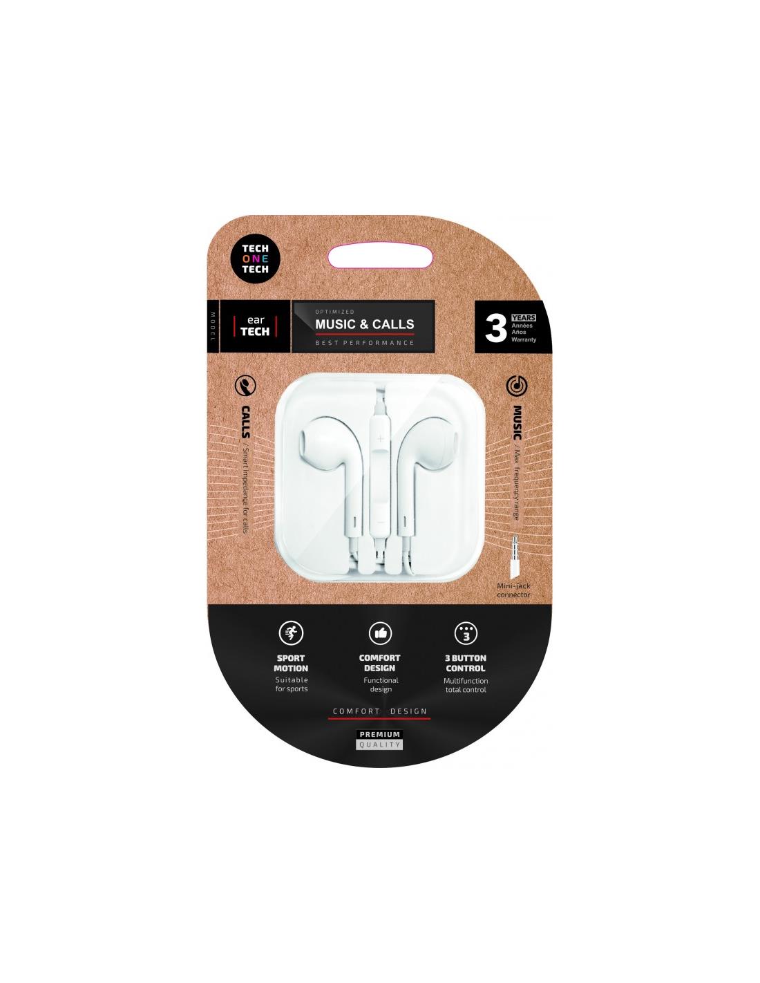 Auriculares earTECH ergonómicos, sonido estéreo, con micrófono, controles de volumen y tercer botón multifunción. Música y llamadas: Amplio rango de frecuencias para una experiencia de música óptima y llamadas de voz. Garantía de compatibilidad con dispositivos Apple, Android y Windows. Factor de forma: Intraural Color: Blanco / White Longitud: Cable 1,2 mt Conector: Mini-jack 3,5mm Frecuencia: 20 Hz - 20Khz Impedancia: 32 Ohmios +-15% Micrófono: -42dB +-3dB