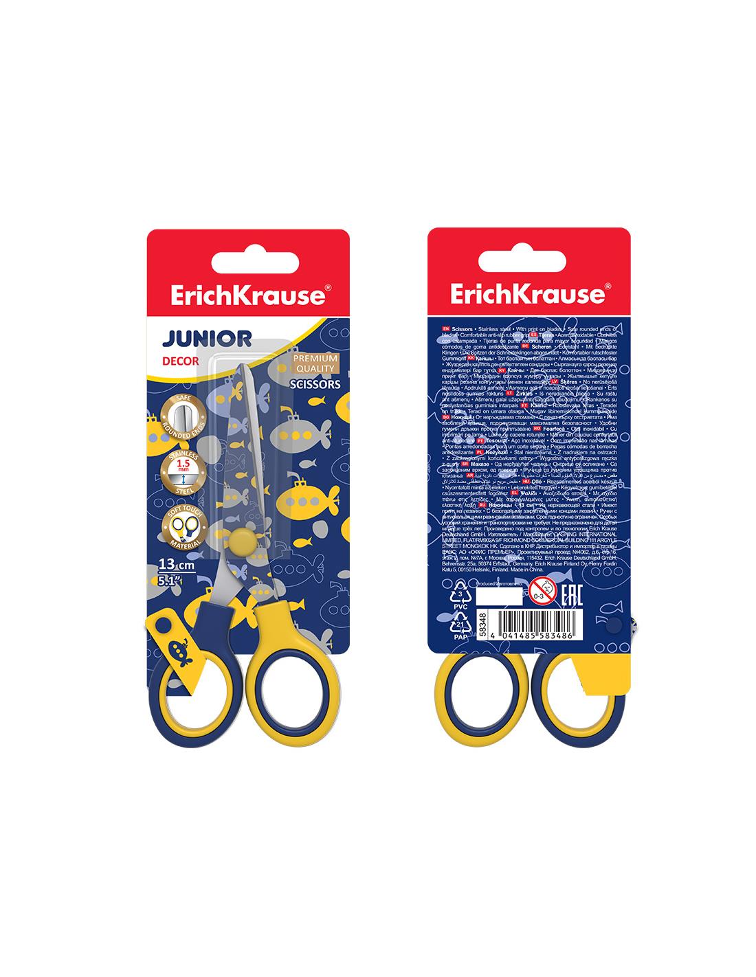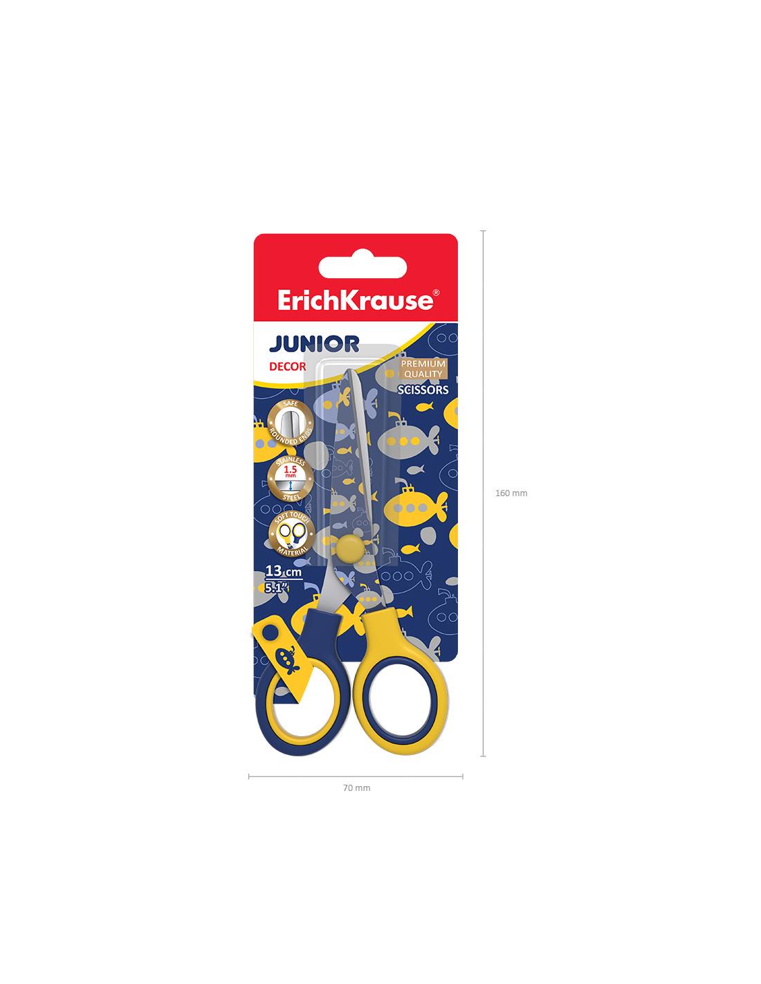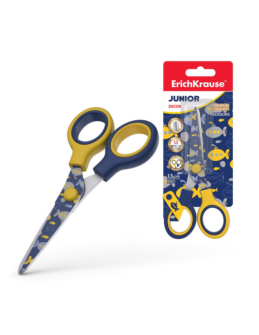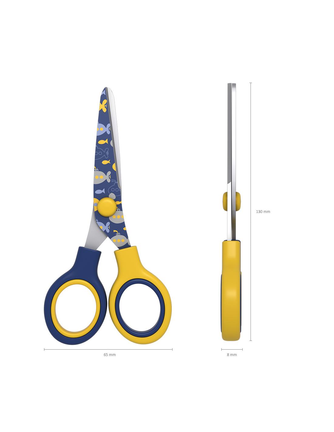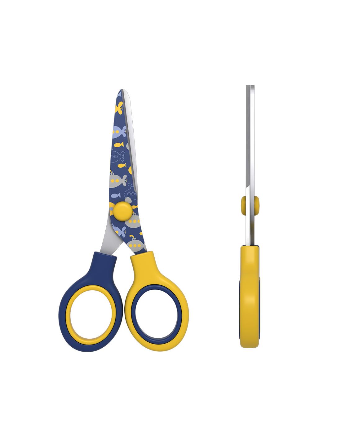 Tijeras con cuchillas de acero inoxidable de alta calidad y extremos redondeados seguros. Resistente a la corrosion.  Mangos de forma clasica hechos de plastico resistente a los golpes con inserciones antideslizantes.