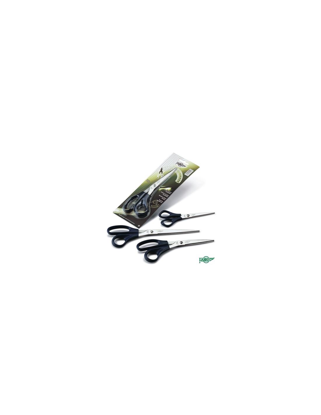Tijeras de oficina de acero inoxidable y punta roma. Empuñadura ergonómica de plástico, presentación en blister. Medida: 21cm.